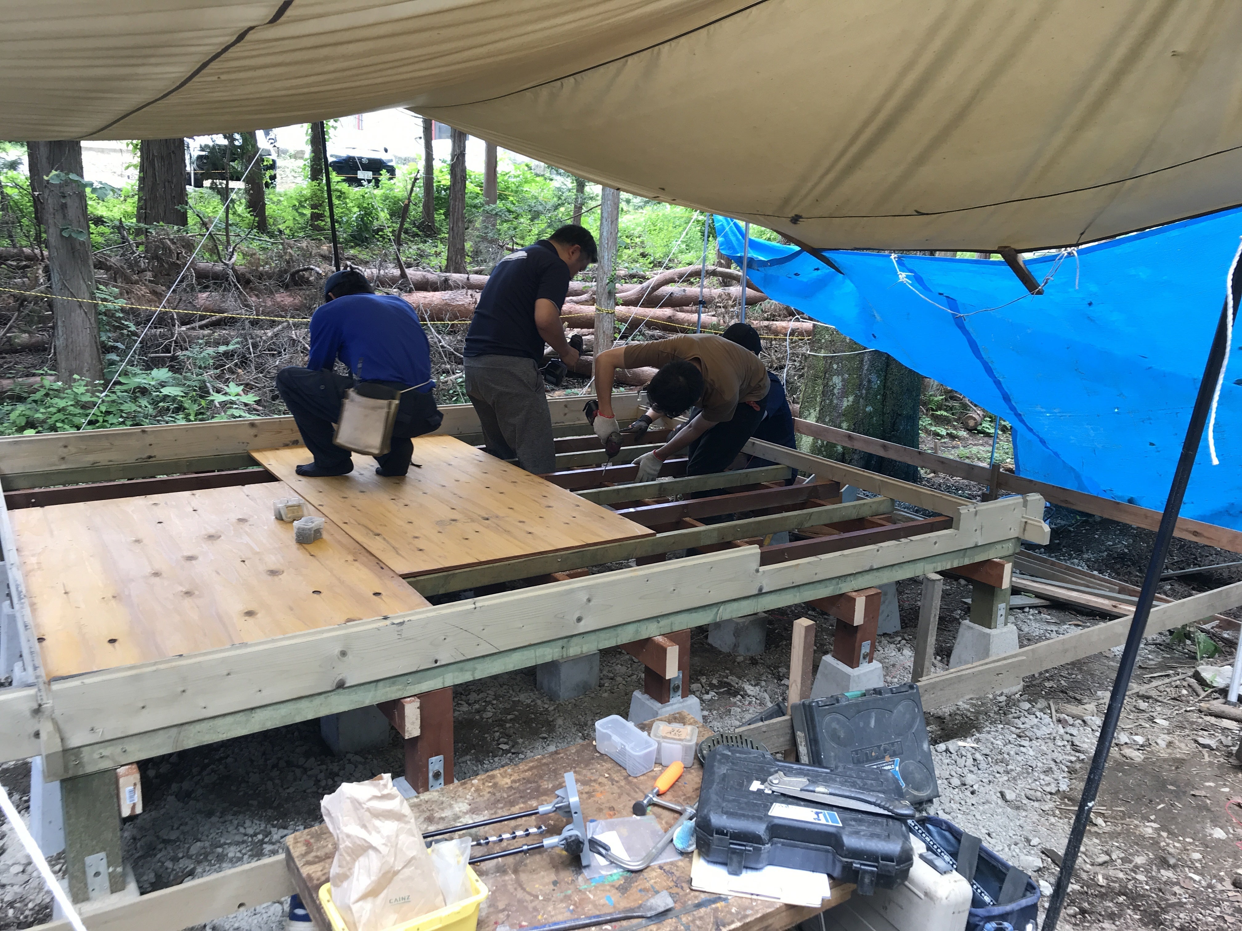 この上に床材を敷き詰めます。ベニヤの床ができると、かなり小屋!の感じが出てきますね。