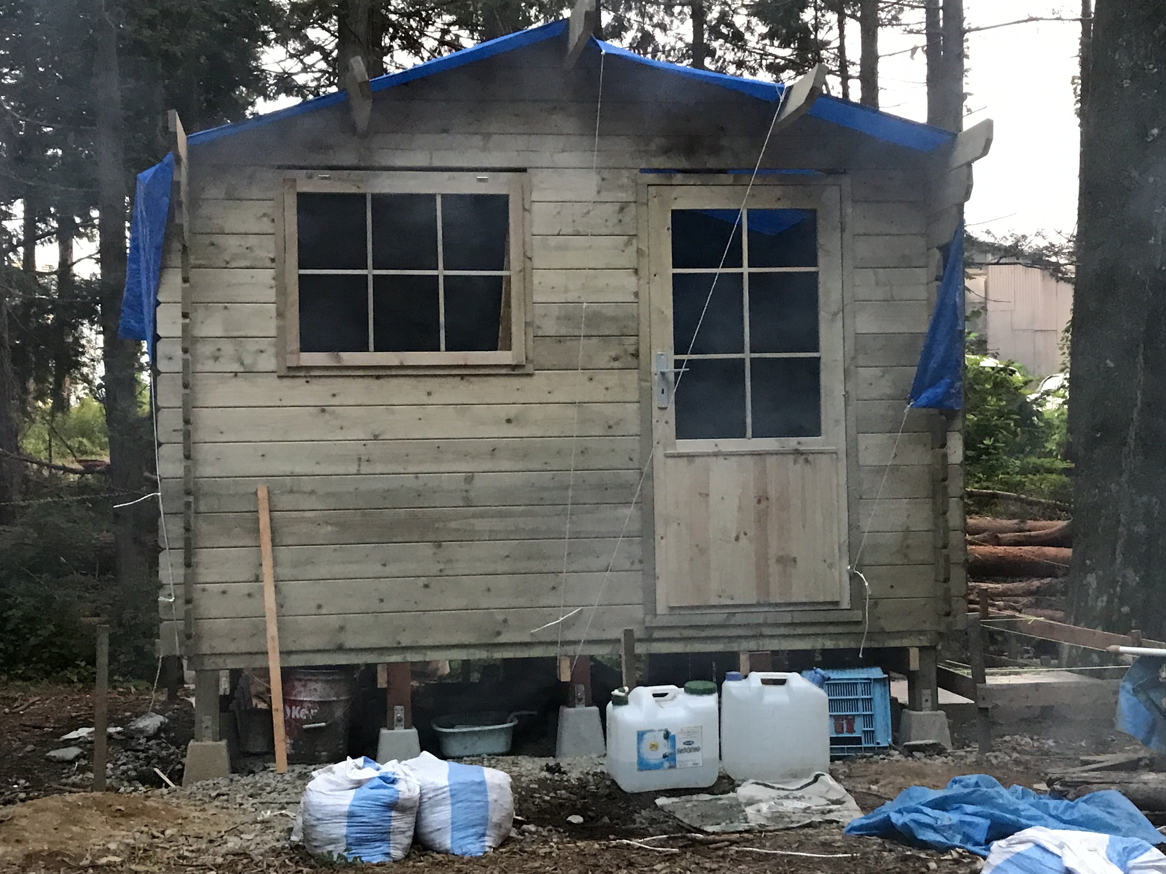 写真はブルーシートで覆ったあとなのでわかりにくいと思いますが、向かって左側の屋根(天井板)を貼り終えて雨よけの養生ブルーシートを貼った小屋の様子です。
