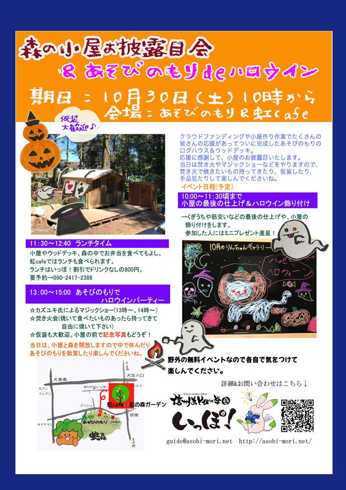 地域の方々に知って利用していただけるように、またこれまでにお力添えをいただいた皆様への感謝を込めて、30日は午前中は最終仕上げを、午後は焚き火やマジックショーを開催するハロウインパーティーを行いたいと思います。
