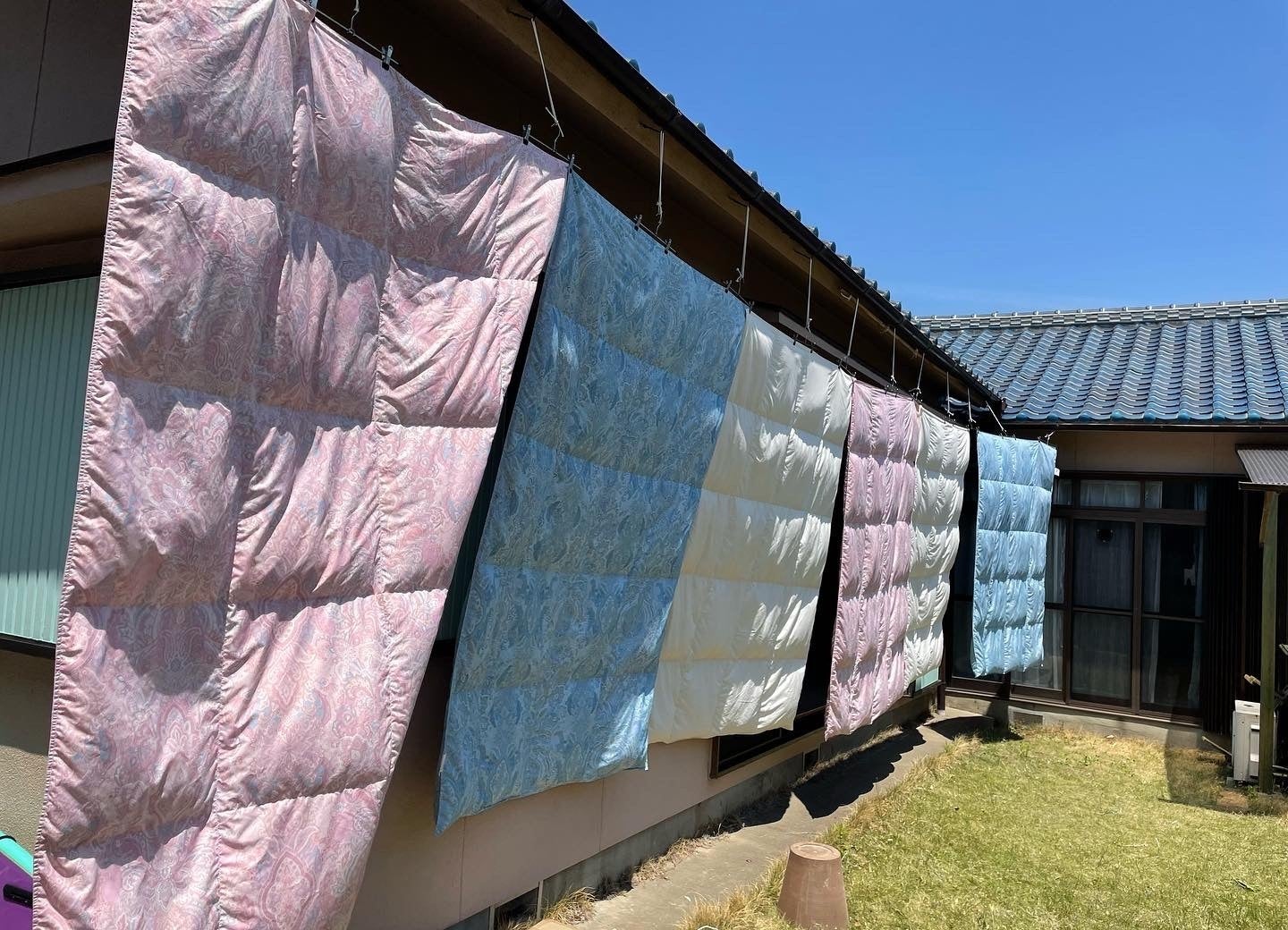 6枚の羽毛布団が高々と掲げられ