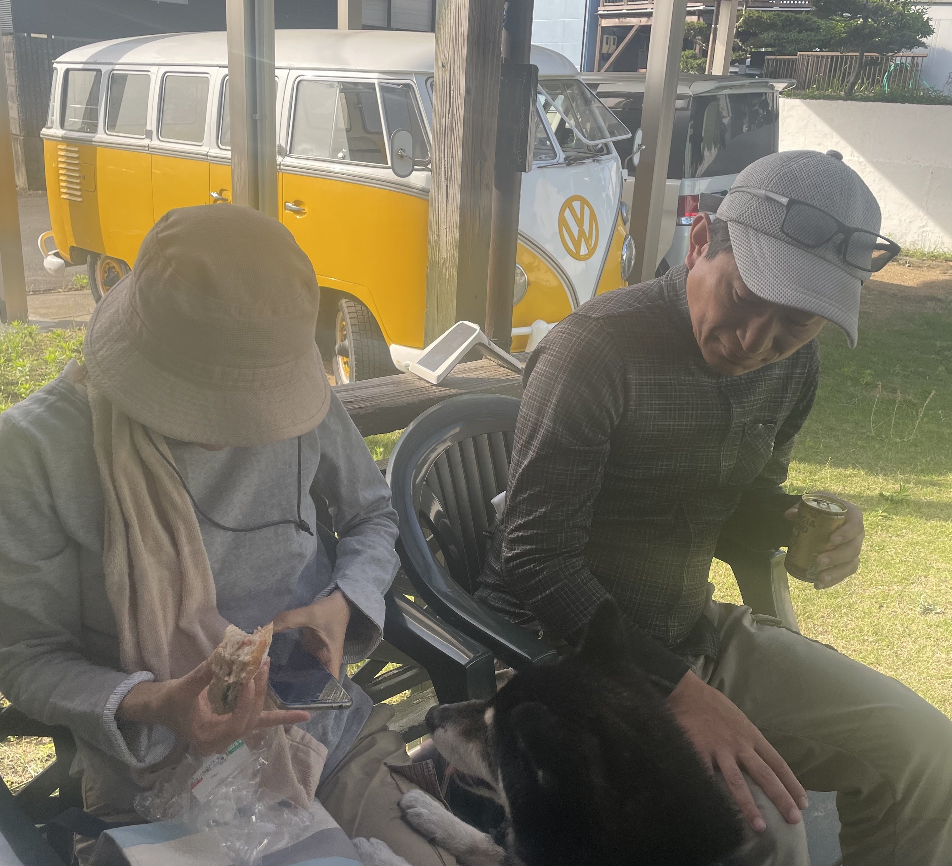 500缶片手に車から降りて来たご主人