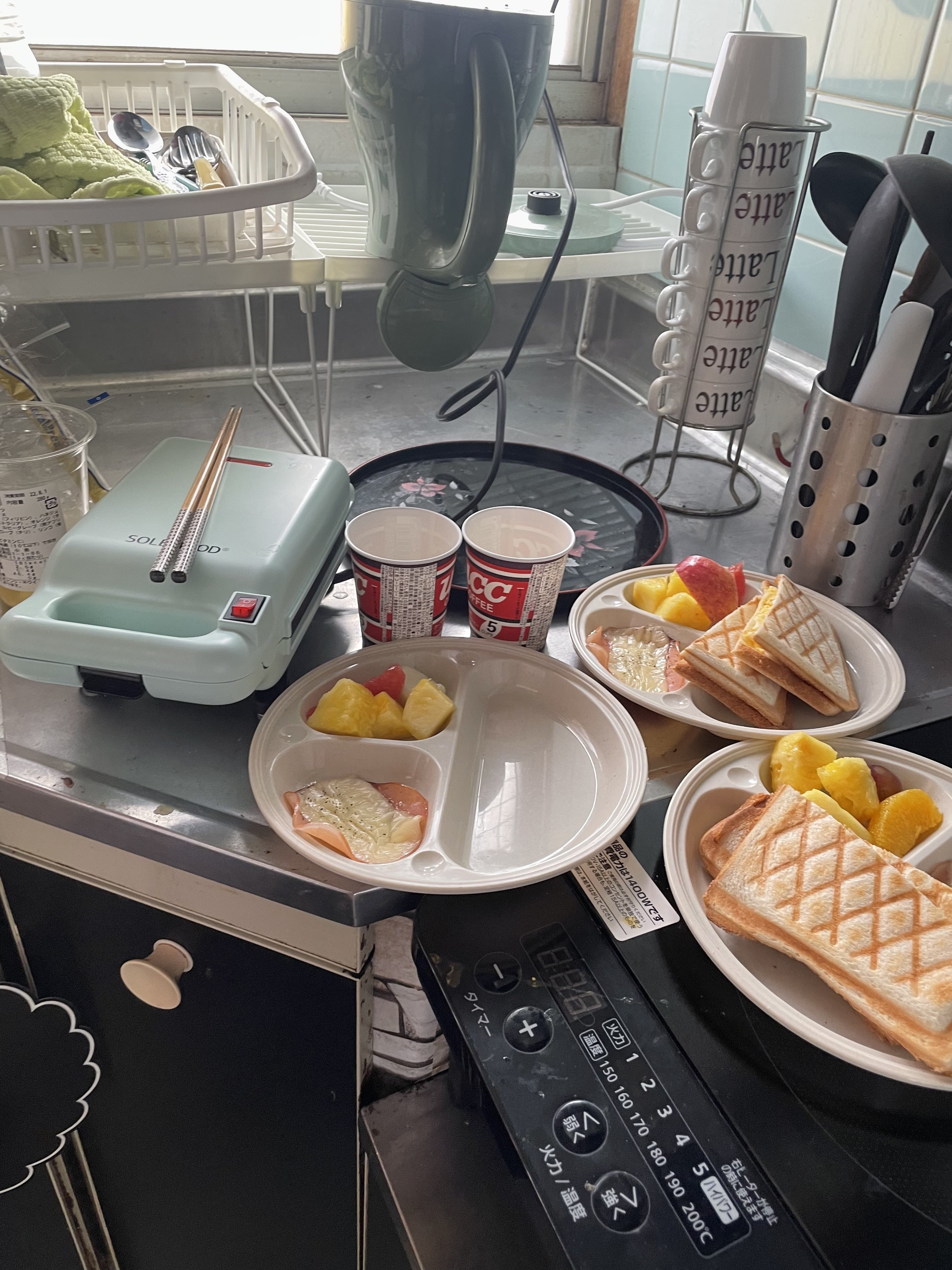 持込みの、ホットサンド機で朝食準備