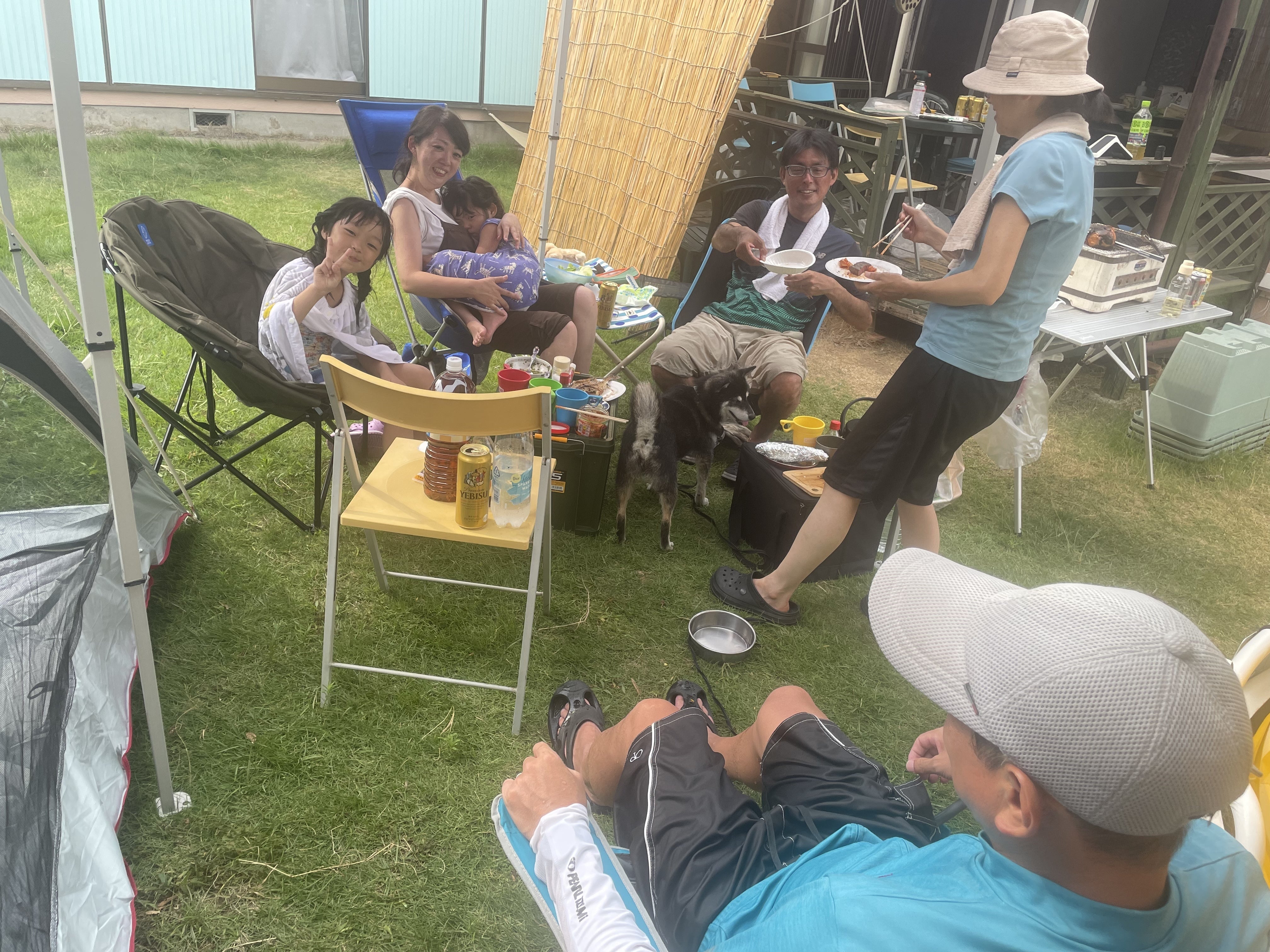 昼過ぎ、4人家族を招きキャンピング