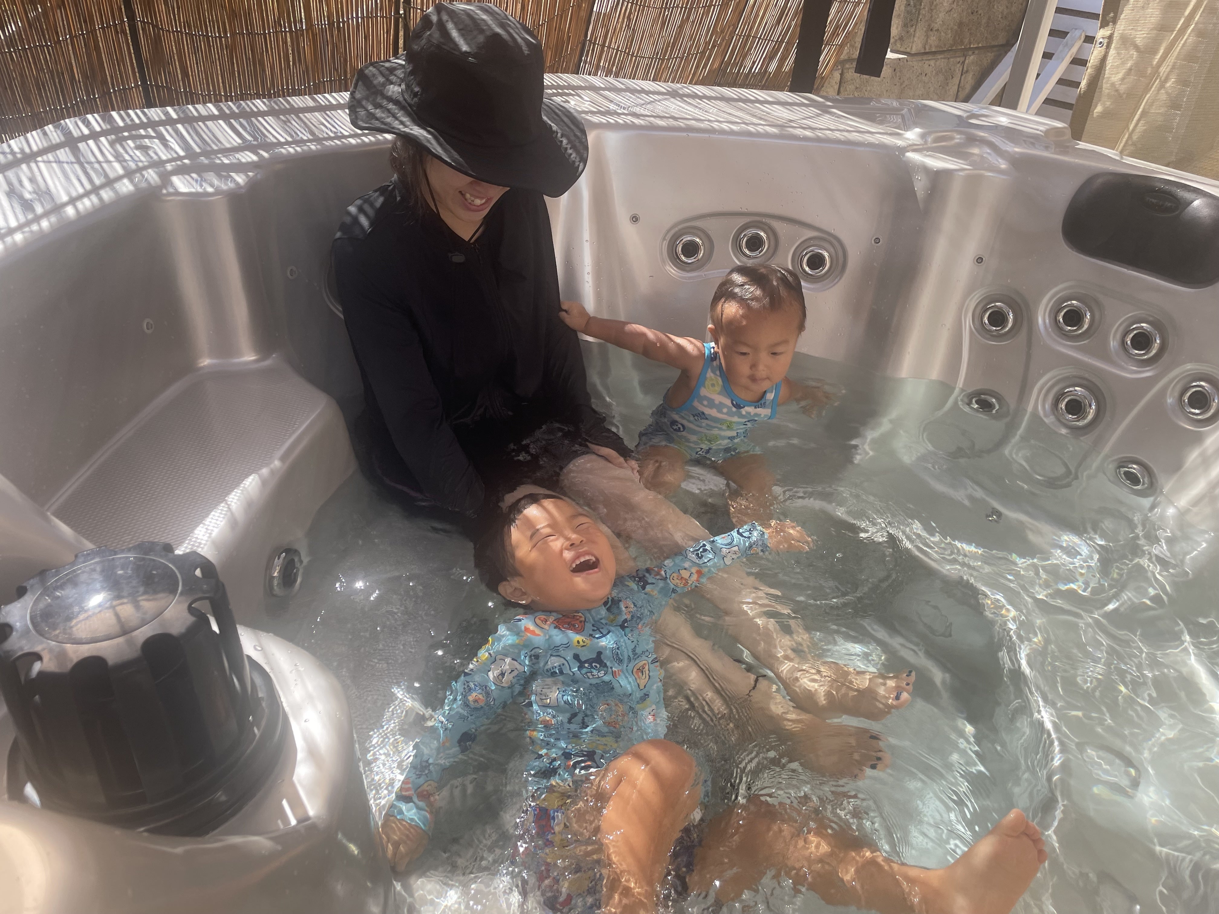 日中に、浅瀬のプールではしゃぐ兄弟