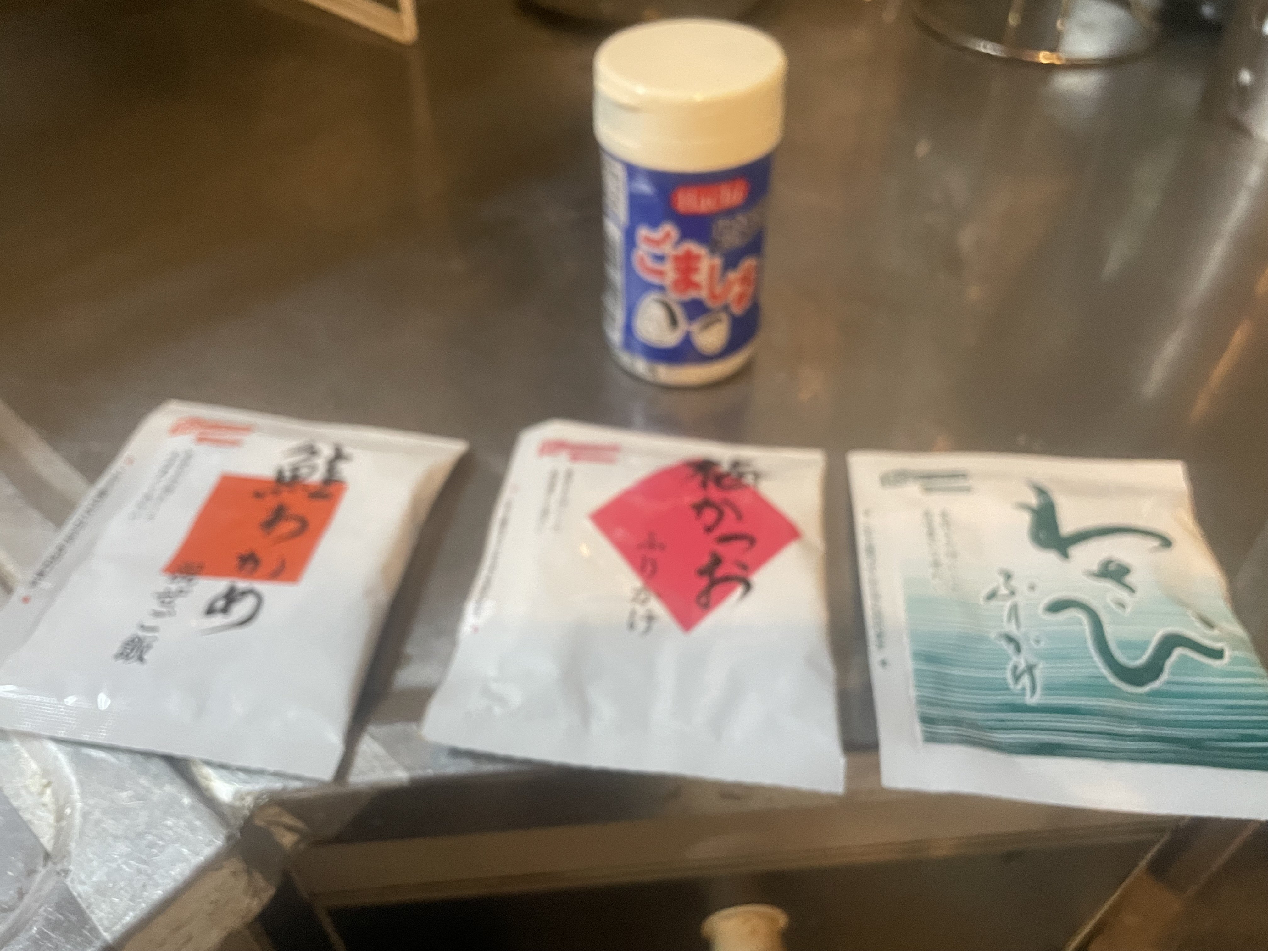 そこで、ゴマ塩、鮭、梅、わさび進呈