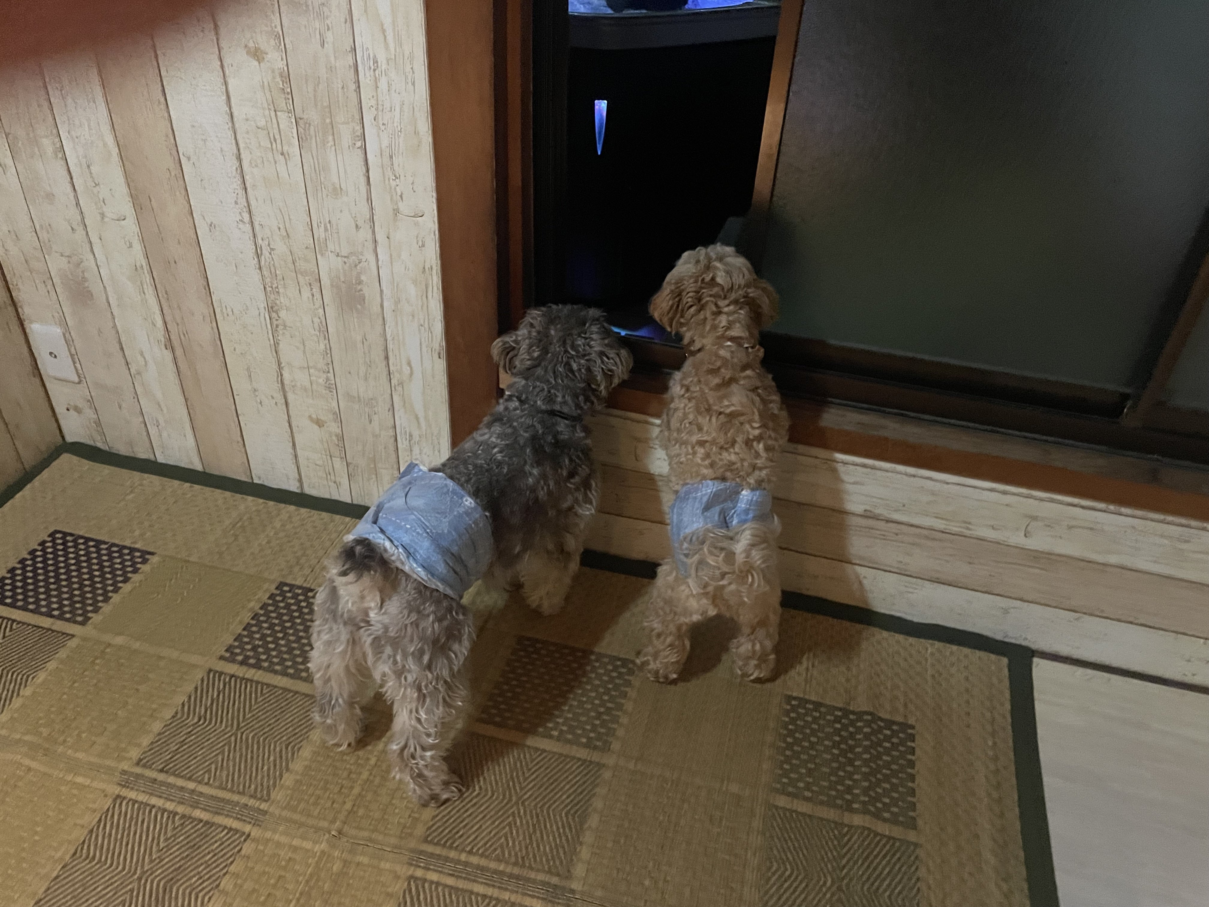 それを、ワンちゃん揃って窓から見学