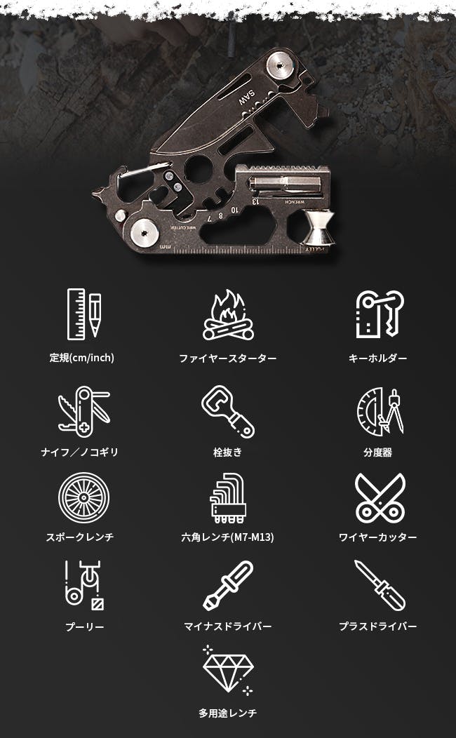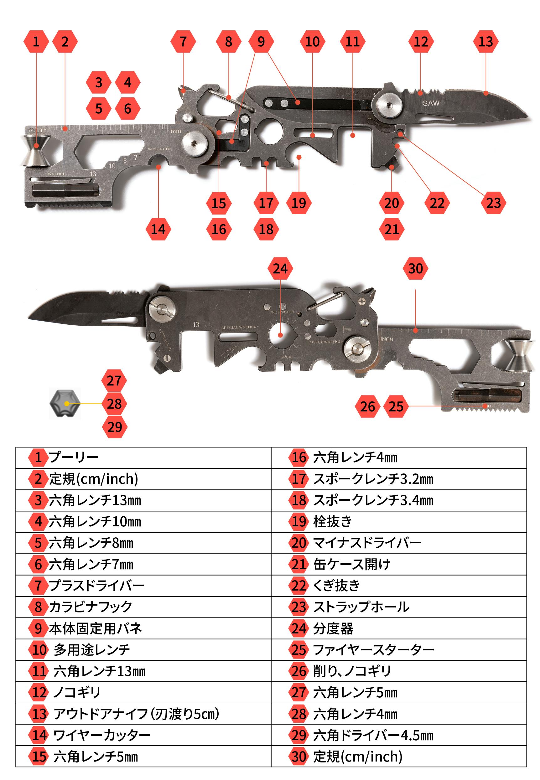 隅から隅まで全部に機能を搭載!その数なんと合計で30個!まさにマルチツールの中の秘密兵器的存在。
