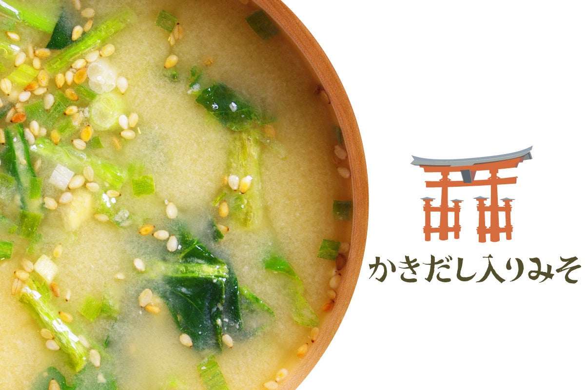 広島県産のかきから、かきエキスを抽出、そのエキスを鰹、昆布のだしと調合し、まろやかでコクのあるみそに仕上げました。広島ならではだし入りみそです。具材は小松菜・ほうれん草・ごまです。