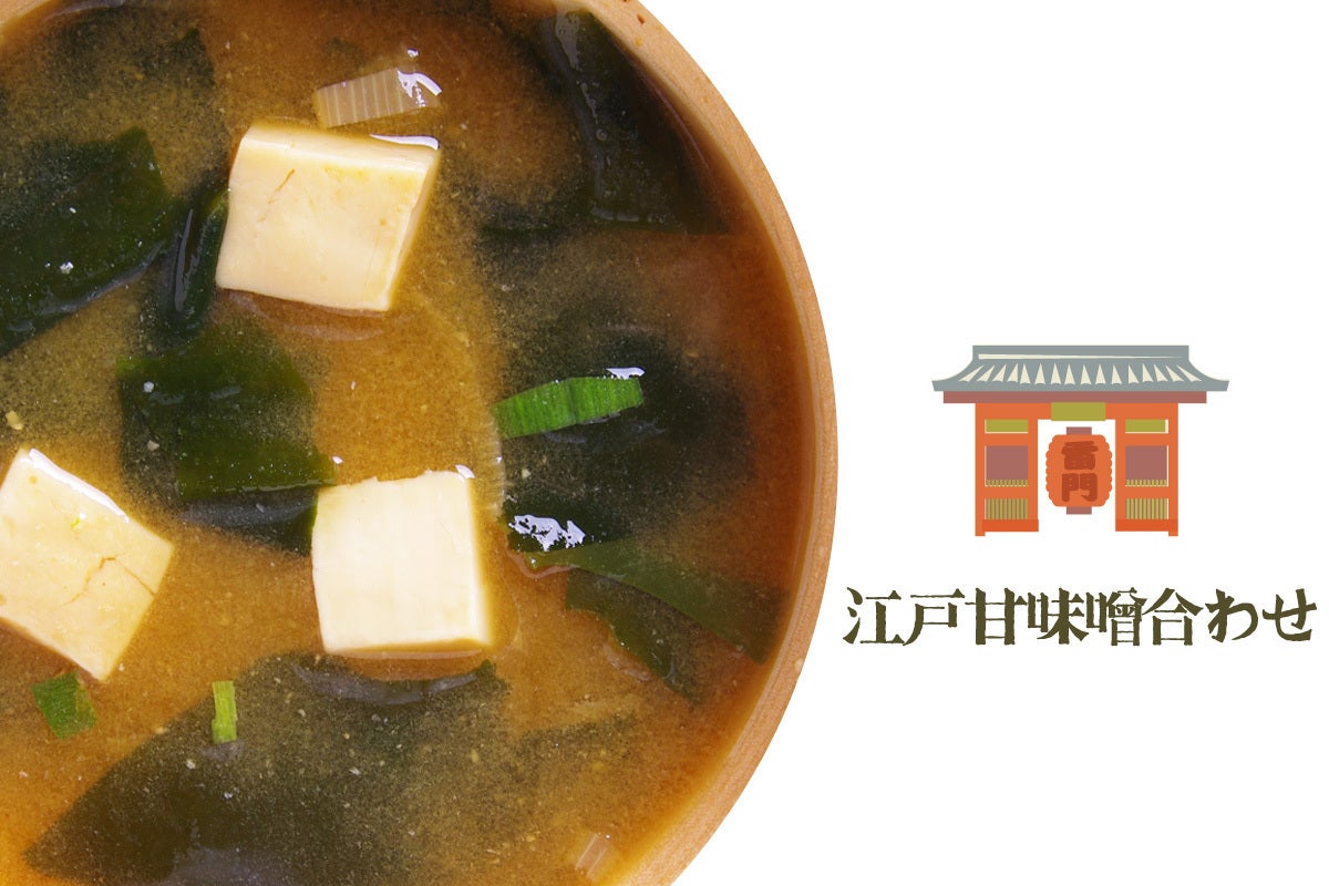 江戸甘味噌は光沢のある茶褐色で、深く蒸した大豆の香味と麹の甘みが渾然と調和し「とろり」とした独特の甘みをもった江戸っ子好みの粋な味噌です。具材は豆腐・わかめです。