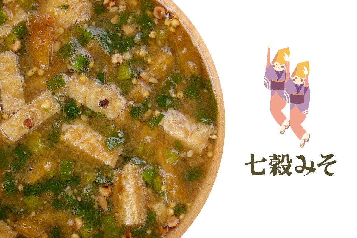 あわ、こきび(もちきび)、たかきび、ひえ、大豆、米、大麦で仕込んだのが、「七穀みそ」です。あっさりとした甘みとほのかなこくのあるお味噌です。。具材はごぼう、ねぎです。