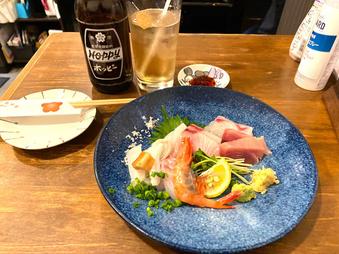 ワンコイン500円で提供しているせんべろ刺し盛り(下写真)ネタは仕入次第の日替わりです