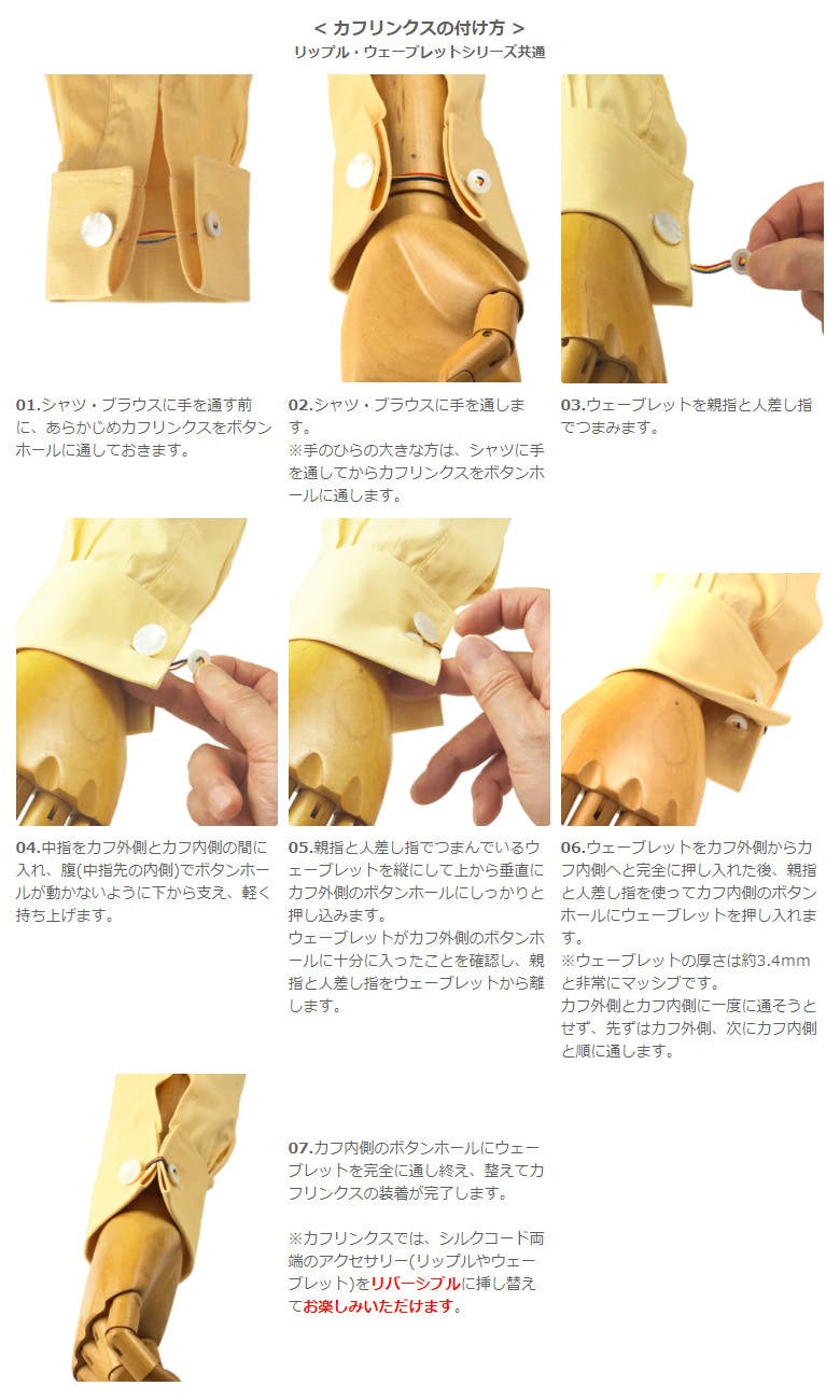 7種類の「リップルとウェーブレットの組合せ」のリターンそれぞれに、7種類の「シルクコードカラーバリエーション 」を展開させ、計49パターンの中から選択が可能です。お気に入りのマルチパーパスアクセサリーを皆様のコーディネートにぜひお加えください。