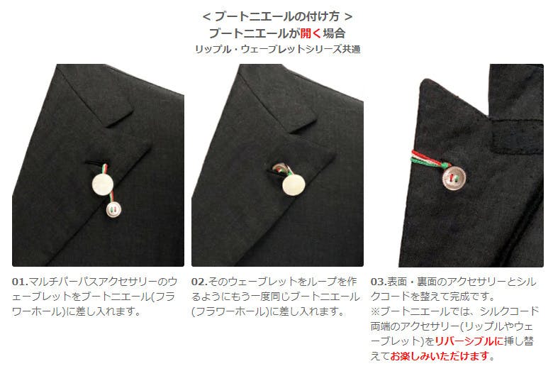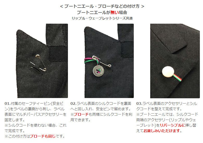 動画のように貴男(あなた)がブートニエール・貴女(あなた)がブローチだったり、ハットオーナメントとバッグチャームだったり、晴れの日だったり普段使いだったり、色んなTPOで便利に使えるプレシャス(貴重)なペアアクセサリー。