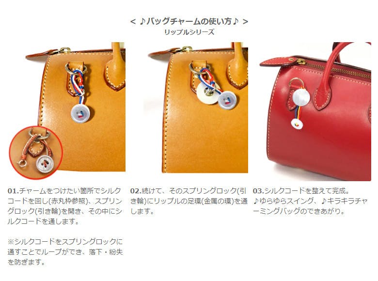 次に、お客様ご希望のカラーバリエーションのシルクコード(Silk Code)の長さでスプリングロック(引き輪)・ウェーブレット(Wavelet)を1つに束ね、リップルシリーズ・マルチパーパスアクセサリーが完成します。