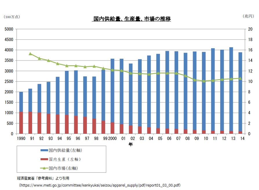 ただでさえ、中国製品をはじめとした安価な海外製品に押され、縫い子さんたちの平均年齢が60歳を超えるなど高齢化し、担い手が減少の一途を辿っている業界です。かつては若い労働力が多く、エネルギーに満ち溢れていましたが、2000年を境に国内生産量は供給量の15%を割り込み、減少の一途を辿りました。