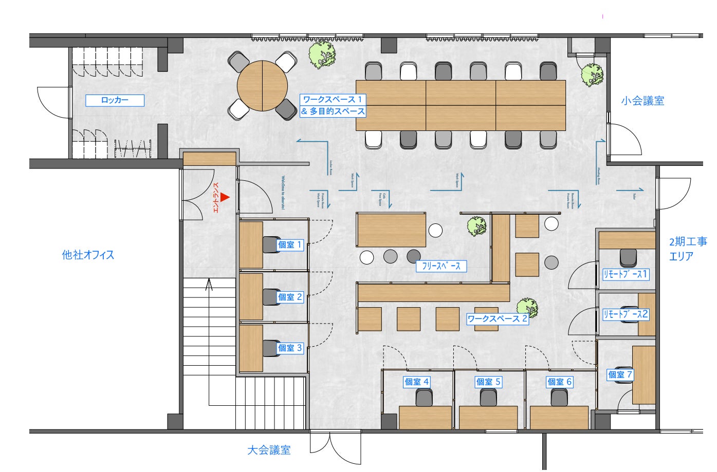 梅雨の晴れ間といいますが、外は30℃超えなのかずいぶん暑くなってきました。工事を進める中で図面がアップデートされましたので公開いたします。変更点1. 個室5席→7席2. 個室7を2人用から1人用へ*配電盤を避けるため3. ワークスペース2の小テーブルを廃止(密接度が高くなるため)4. 窓にカーテンを設置5. ロッカースペースを若干縮小*当初設計時のロッカーサイズ間違いのため6. シューズロッカー(靴棚)の設置7. 換気装置のアップグレード個別ブース予約状況予約2席 / 全体7席 残り5席です。*個室5は確定済みテレワークブース個別ブース