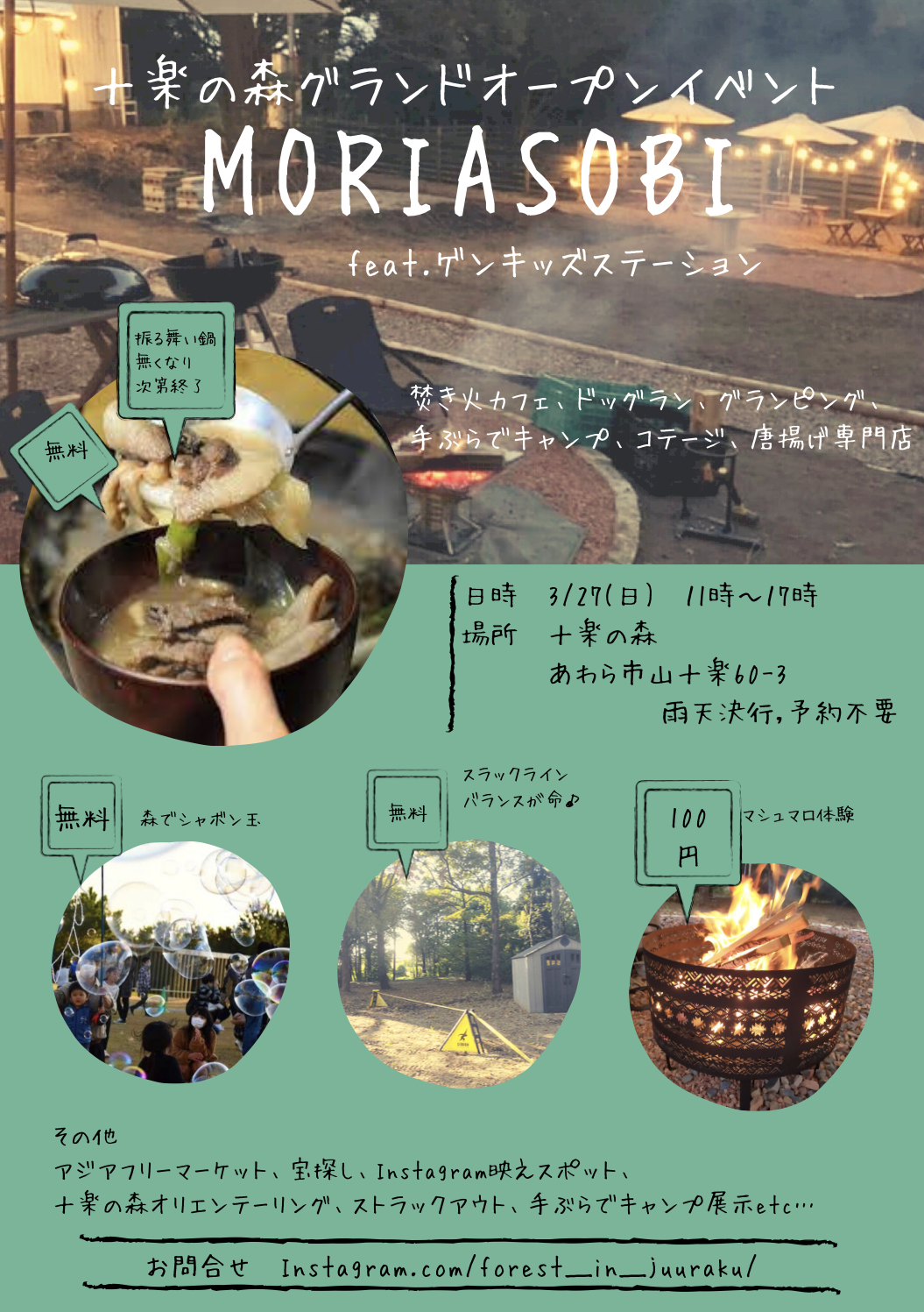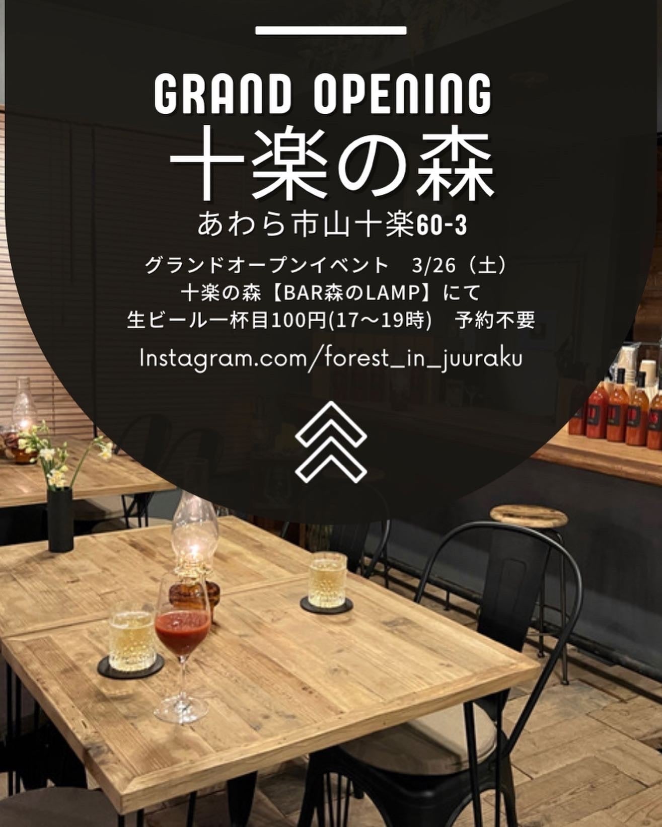 2022/03/15 12:09あわら市の「十楽の森」3月26日~27日のグランドオープンイベントのご案内をさせていただきます。26日は前夜祭で、BAR森のLAMPにて1杯目生ビール100円となります。27日は、「MORIASOBI」というイベントになります。ゲンキッズステーションの方々と共に自然に触れ、外遊びの楽しさを伝えるとともに、地域の魅力を発信していけるようなイベントにしたいと思っています。振る舞い鍋がある他、シャボン玉や、スラックライン、十楽の森オリエンテーリング、焚き火体験など、子どもも大人も楽しめるような内容となっております。皆様のお越しをお待ちしております もっと見る3月26~27日オープニングイベントについて
