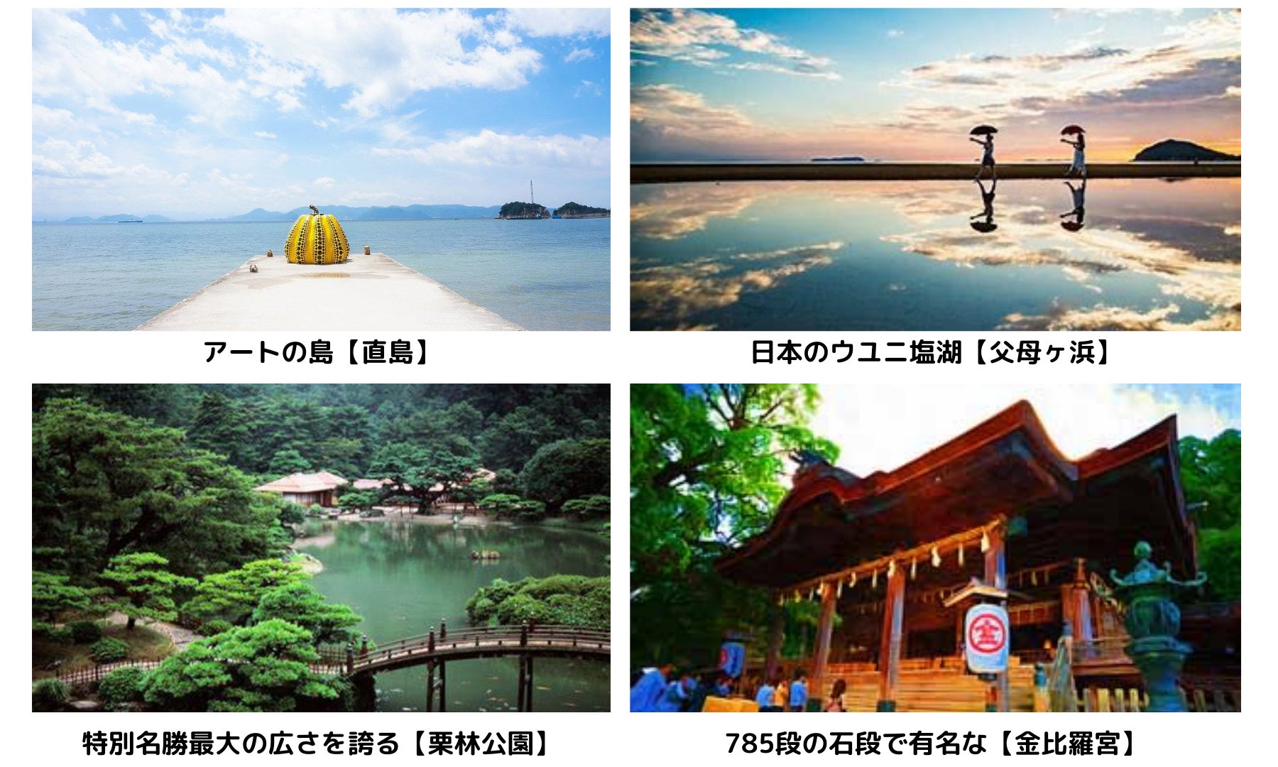観光地では世界的に有名な父母ヶ浜【日本のウユニ塩湖】や785段の石段で有名な金比羅宮などがあります。