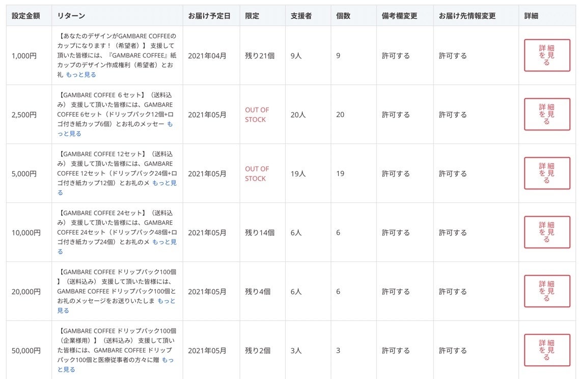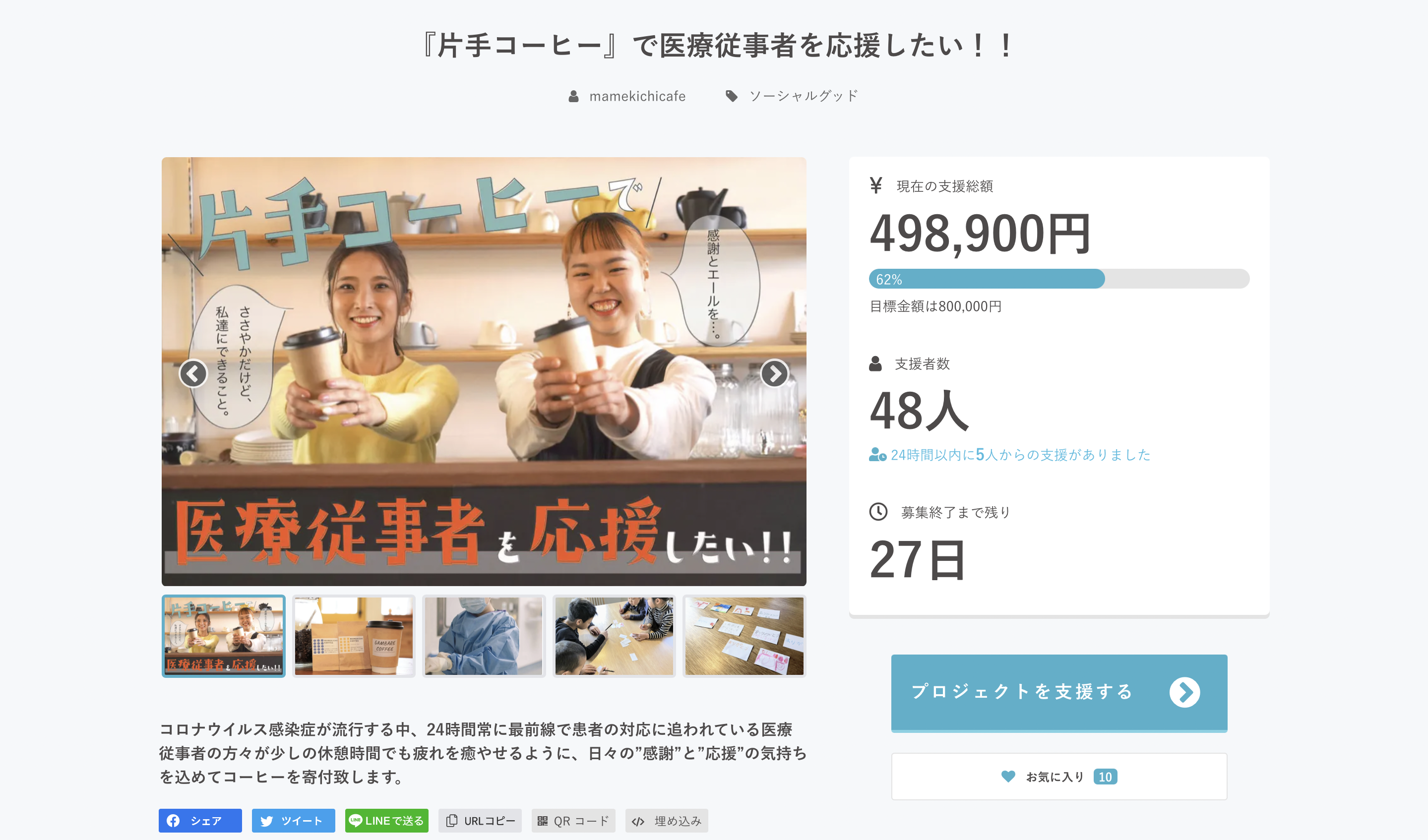こんにちは!開始6日で、現在約60万円の支援額が集まっています。今日も感謝の気持ちでいっぱいです。ありがとうございます医療従事者の方々に支援者みなさんの熱い気持ちを乗せてコーヒー贈ることはもちろん、支援して頂いたみなさんにもわたしたちから感謝の気持ちを込めて、いいリターンをお届けできるように準備を進めています。箱の大きさだったり、デザインだったり、毎回頭がフル回転です、、どんなものが届いたら嬉しいか、ワクワクするかを考えています!もし、「こんなものはどう!?」って言うアイデアがありましたら、気軽に言ってください!インスタ映えに疎いわたしたちを助けてください。笑よろしくお願いします!!以上。第3回活動報告でした☺︎ひなた