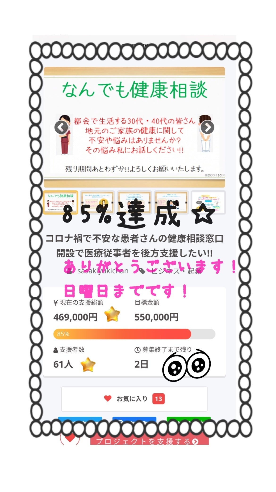 みなさまこんばんは♫感動のフィナーレから1週間。公式LINEに配信した内容をお届けします。↓↓なんでも健康相談の公式LINEにご登録ありがとうございます。クラウドファンディング終了から1週間経ちようやく予約システムの立ち上げができました。遅くなってすみません(^_^;)本業+クリニックお手伝いで現在20連勤中のため、なかなか着手できませんでした。クラウドファンディングリターンの皆様には本格始動前のお試しをご利用いただくことになり大変恐縮ですが、resarva(レザルバ)のオンライン予約システムより、リターンの健康相談をご予約ください。☆ご予約は4/10以降でお願いします。https://reserva.be/nandemohealthconsultant2021予約方法がわからないなどありましたら、こちらのチャットからお気軽にご質問くださいね(๑˃̵ᴗ˂̵)(返信はわたしにしか読めません)ご予約いただいた方には基本的にはzoomのミィーティングルームをご案内しますが、その他の方法をご希望の場合、ご希望の連絡方法をお知らせください。お手数をですがよろしくお願いします。新年度、新学期、みなさんのいろんな気持ちに寄り添いたいと思っています☆↑↑そんなわけで、リターン②③をご選択のみなさま、上記URLからリターンのご予約をお願いいたします。リターン①の方への御礼のメールはアンケートがまだ完成していないのでもう少しお待ちください。公式LINEのご登録が、まだの方もぜひLINEからご登録をお願いします。https://lin.ee/IB2ibn2公式LINEは、個人でやっているLINEとほぼ同じで、メッセージはわたしにしか読めませんので、何かあればお気軽にご質問などお寄せください。予約システムは現在簡単に手続きできた上記サイトにしましたが、ご利用くださる皆さんからのご意見で変更も検討いたします。なにしろ素人が手探りなので、どんな意見でも遠慮なくお願いします‼︎もしも80名もの方からご意見いただけたらさぞかしいいものが出来上がるに違いない(^з^)-☆春眠暁を覚えず…?今日は眠いなぁと思っていたら娘も同じこと言ったし、道ですれ違った若者も「今日はたまらなく眠い」と言ってました。お天気のせいかな?みなさんはいかがですか?4月も健康に過ごせますように♡sasakiyuki