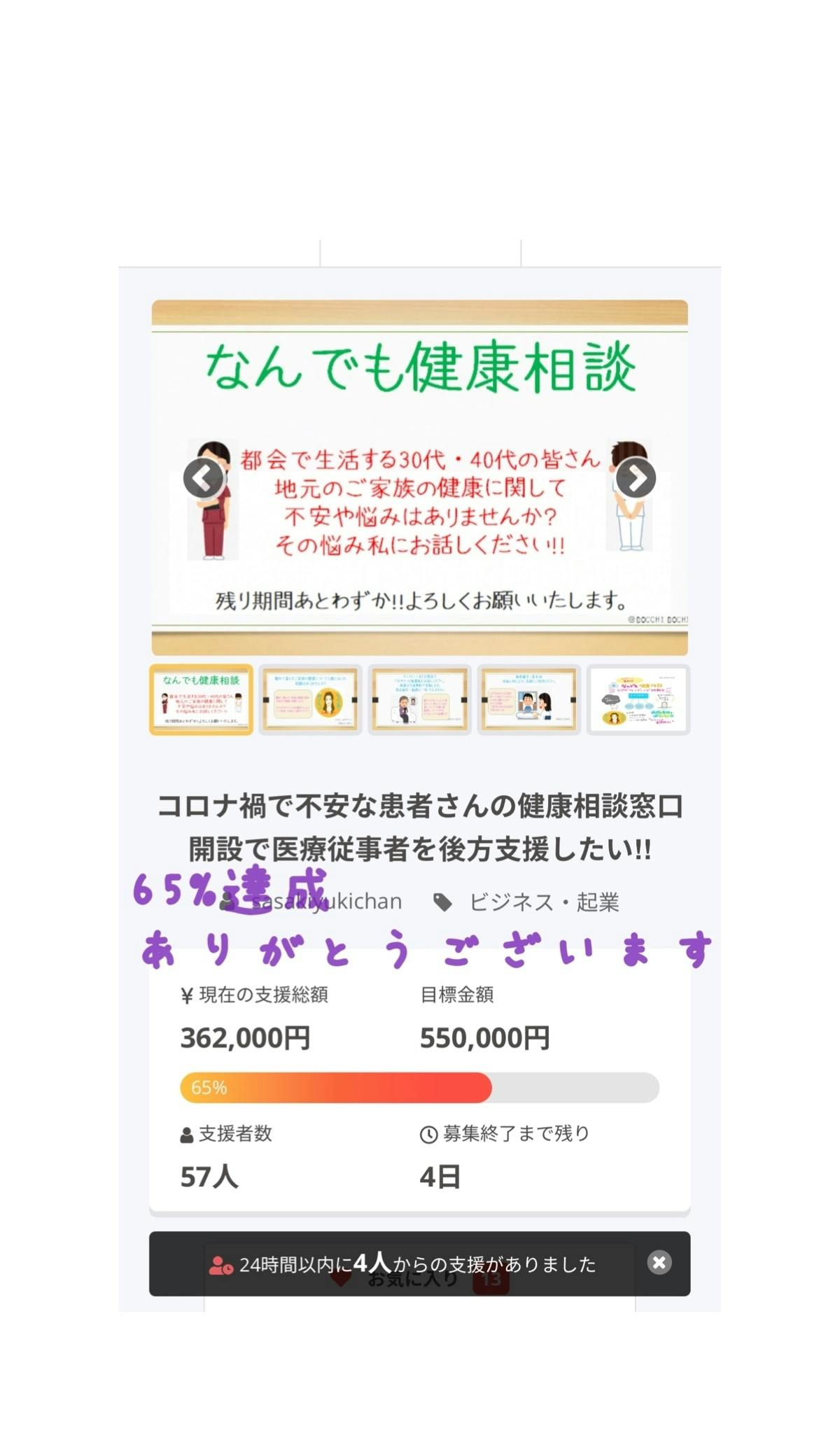 みんなにお手数かけながらもこの2日間で59%→65%までご支援が増えました。