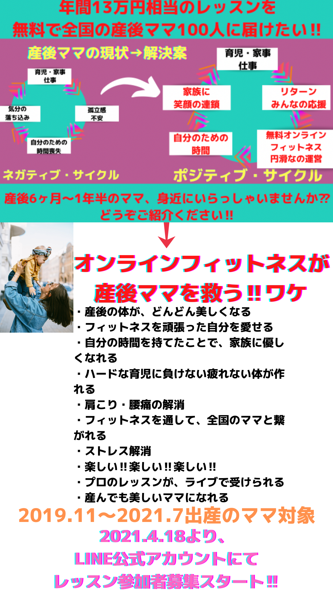 これらの強い想いと実体験から、このプロジェクトを通して、産後6ヶ月から産後1年半のママに、双方向のコニュニケーションを取ることができ、ママ同士も繋がれるグループオンラインフィットネスを無料で提供したい‼︎のです。