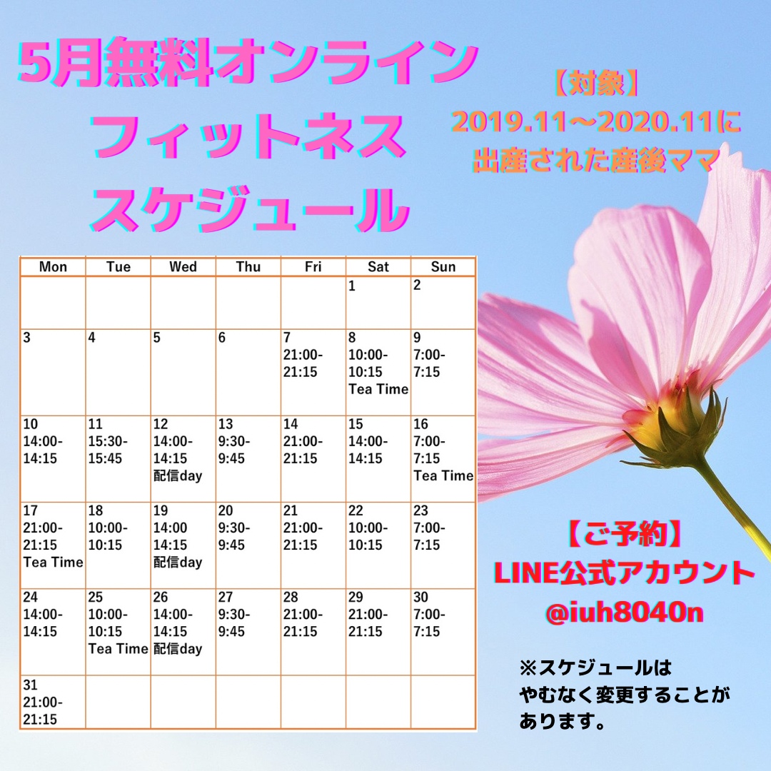 2021/04/30 12:03クラウドファンディングで、皆様に応援いただいたお力をお借りして、早速、産後ママへの無料オンラインフィットネスを、5月7日より、開始致します。まずは、5月のスケジュールがこちら↓【5月対象の産後ママ】2019年11月〜2020年11月に出産されて、体調に異常のない方。【ご予約&お問い合わせ】ALOALO のLINE公式アカウント(ID:@iuh8040n)代表:武田 博美【方法】①上記の5月スケジュールで、参加したい日程を、ALOALOのLINE公式アカウントより、ご予約ください。普通のLINEを使うのと同じように、トークから、お名前、参加したい日時をお知らせください。②レッスンは、ZOOMを使用し、15分のグループレッスンとなります。ZOOMの使い方に不安のある方は、一緒に繋ぐ練習をしましょう♬♬お気軽に、公式アカウントから、その旨をお知らせくださいね。日程を決めましょう♬♬③当日、ママや赤ちゃんの体調などで、急にキャンセル…なども大丈夫です‼︎ご予約やキャンセルは、当日、レッスン開始30分前まで、承ります。ママや赤ちゃんの体調に合わせて、まずは、フィットネスを体験してもらえたら嬉しいです♬♬きっと、ママと赤ちゃんにとって、happyな時間になりますよ♬♬④グループレッスンには、参加しづらいというママには、1週間に一度(15分)になりますが、配信型のレッスンをお届けしますよ。ママと赤ちゃんのタイミングに合わせて、お好きな時間に、何度もフィットネスを楽しんでいただけます。こちらをご希望のママも、公式アカウントのトークからお知らせくださいね。⑤週に一度、TeaTimeを設けてあります。フィットネスを楽しんだ後に、各自、好きなお茶を持ち寄って、いろんなことをおしゃべりしましょう♬♬もちろん、こちらだけのご参加も、大歓迎です。公式アカウントのトークから、ご予約ください。その他、できるかぁって不安な気持ちとか、ご不明な点とか…何でも、お気軽に、公式アカウントから、ご連絡いただければ、嬉しいです♬♬そして、とにかく、明るく、元気いっぱいに、産後ママの皆さんをハグするような気持ちで、お迎えしますので、安心して入って来てくれると嬉しいです。お知り合いに産後ママがいらっしゃる皆様には、こんなことやっている人いるよーってシェアしていただけると嬉しいです。産後ママたちとフィットネス♬♬ワクワクでいっぱいです‼︎ もっと見るご支援、ご協力、本当にありがとうございました‼︎