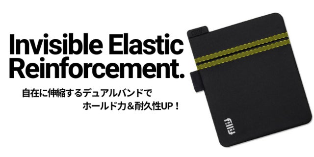 初代モデルのFillit Pocket 1.0は、高品質の合皮素材の台座とストレッチ素材のポケットで構成されたシンプルなデザインです。(デュアルバンド・デュアルフラップ・ペンループはFillit Pocket 2.0の機能です。)