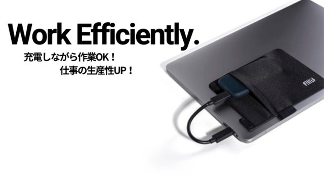 横貼りにして、バッテリー本体をFillit Pocketに収納したまま、ケーブルで接続し充電できます。外付けHDDも収納したまま接続OK!