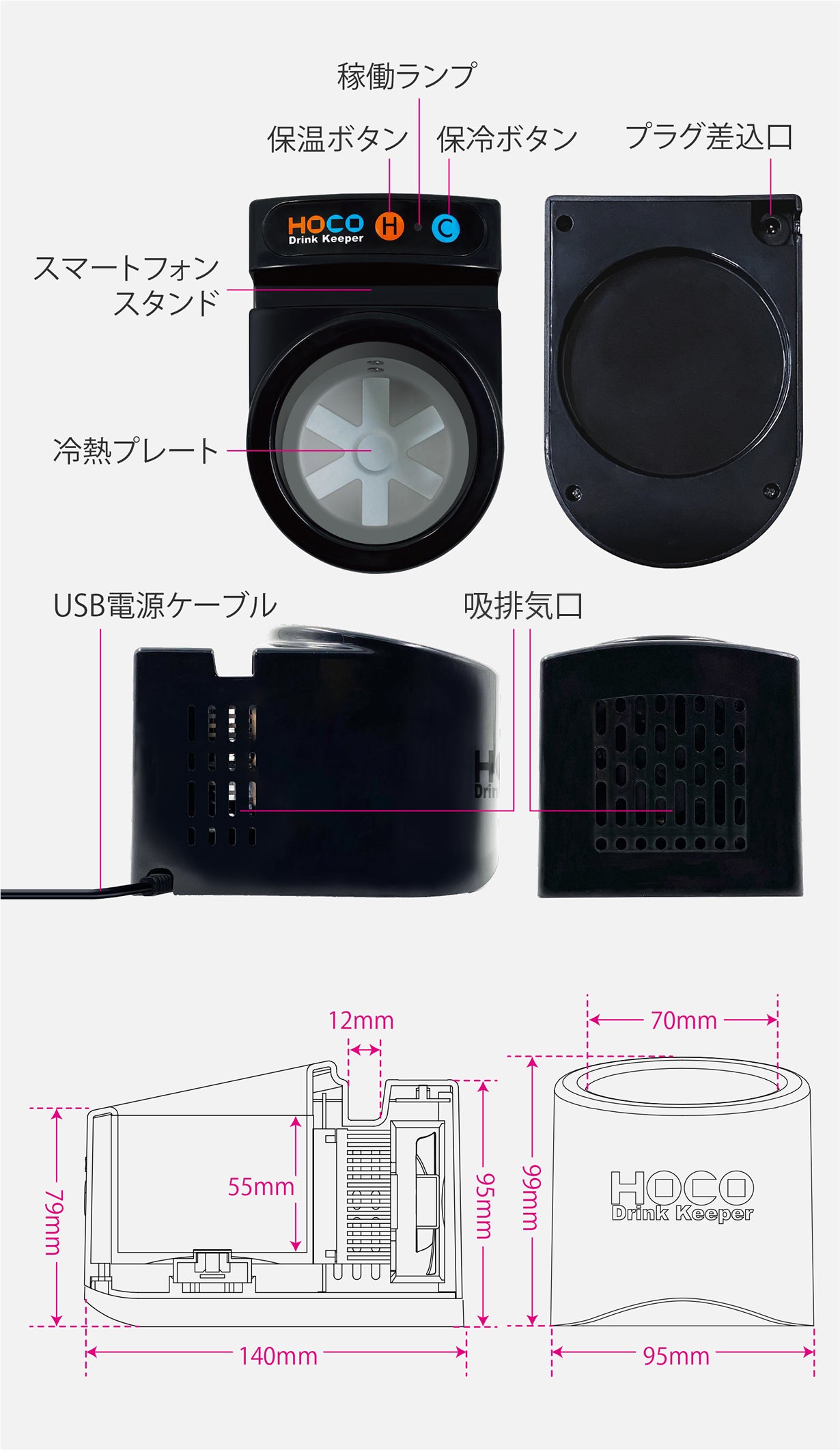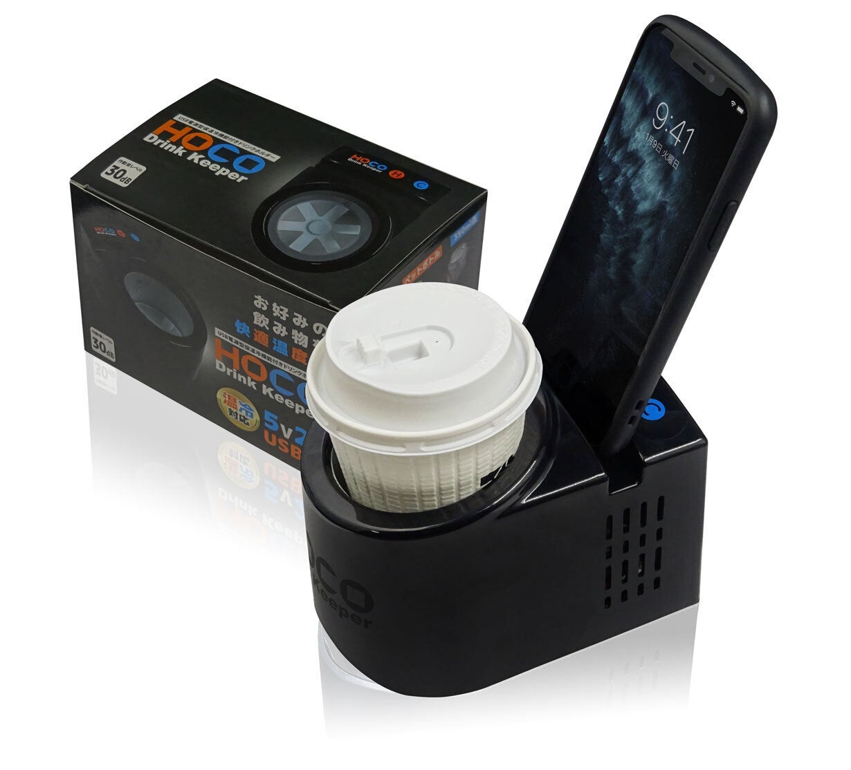 保温冷機能付きドリンクホルダー「HOCO」は、保温は約45℃前後、保冷は約8℃前後で稼働します。従来の卓上ドリンクウォーマー(保温)機能だけでなく、クーラー(保冷)機能もついているので1年間365日活躍できるドリンクホルダーです。