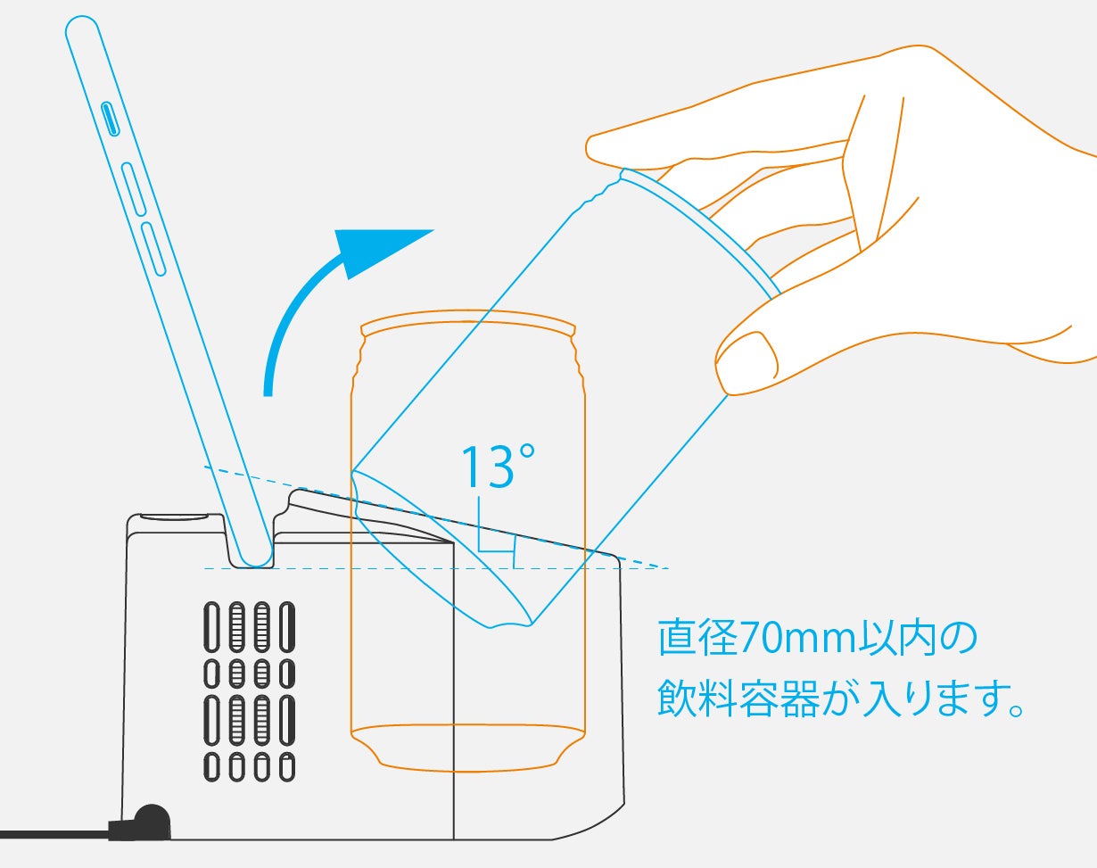 本体は緩やかな台形になっていますので外部からの衝撃による転倒に強く、取り出し口に13°の傾斜をつけてドリンクを取り出しやすくしたデザインも特徴です。