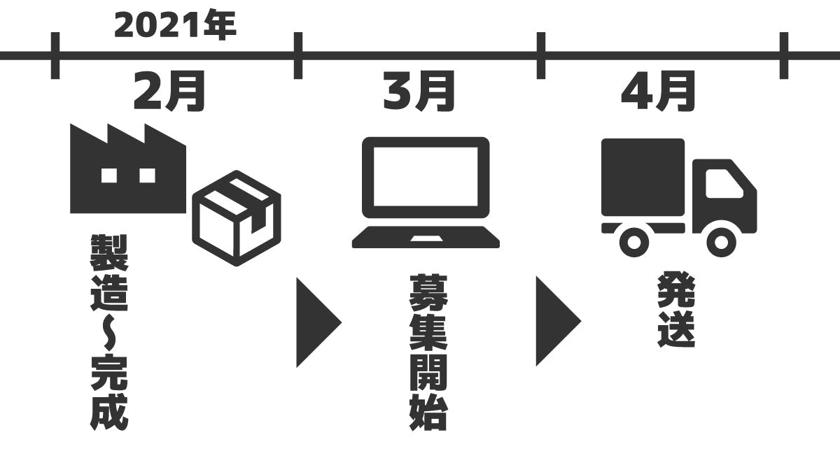 皆様をお待たせすることはございません!…が、募集数が予定数を上回った場合、発送が1〜2か月ほど遅延する可能性がございます。どうぞご了承ください。