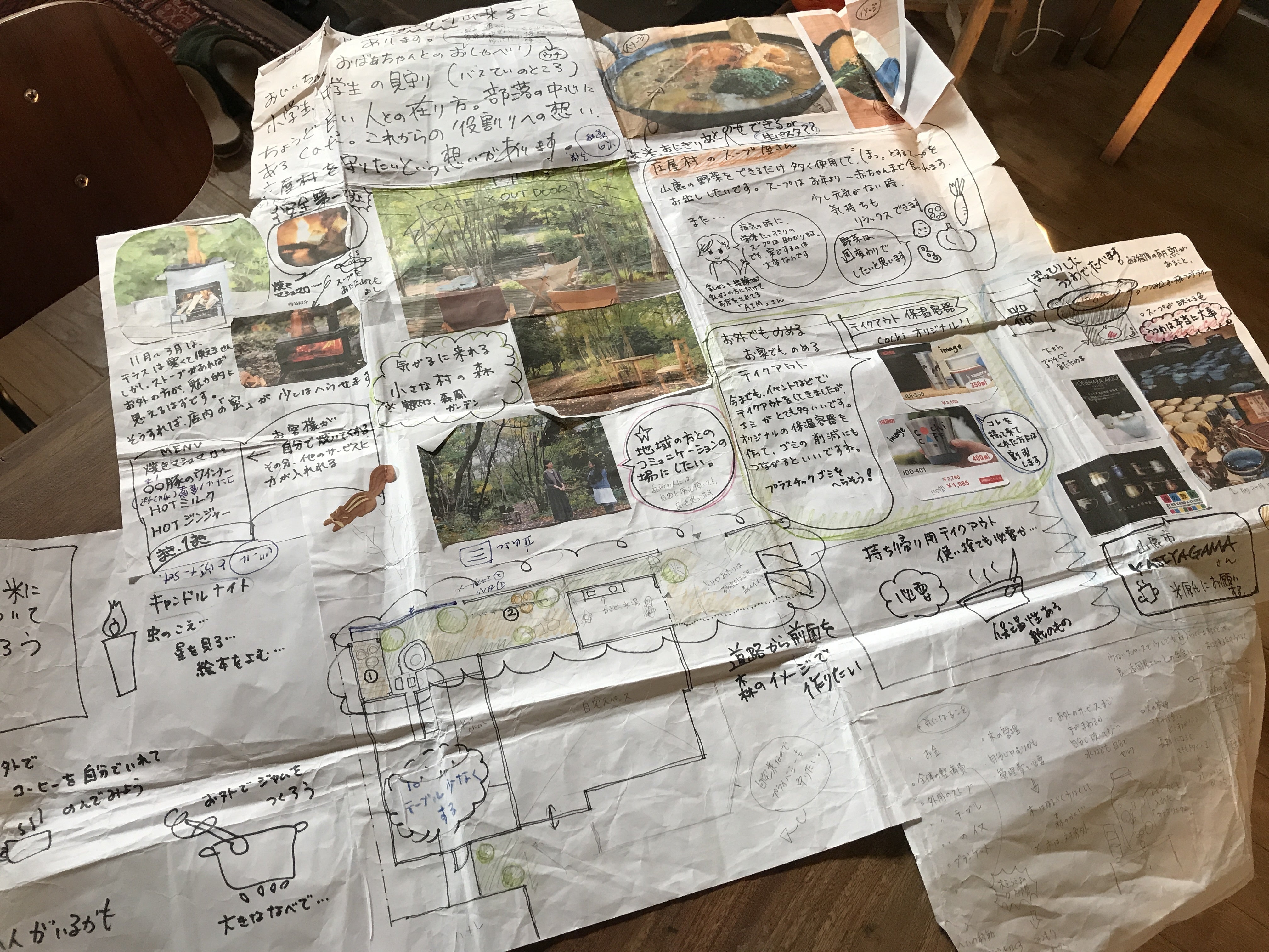 そこから私の妄想が現実へ向けて急ぎ足になりました。まずは頭の中にあるイメージを1枚の紙に描いていきました。足りなくなったら継ぎ接ぎして広げていきました。それを持って沢山の方に意見を聞きました。まずはパートナーである夫。そして、二人三脚の建築屋さん、市役所や窯元さん卵屋さんに農家さん同業者の仲間、担当の税理士さん、友人。不思議な事にこのイメージノートが広くなっていくのと同じ様に応援してくれる仲間も増えて行きました。とても心強く感じました。今はもうこのイメージノートはボロボロです…笑