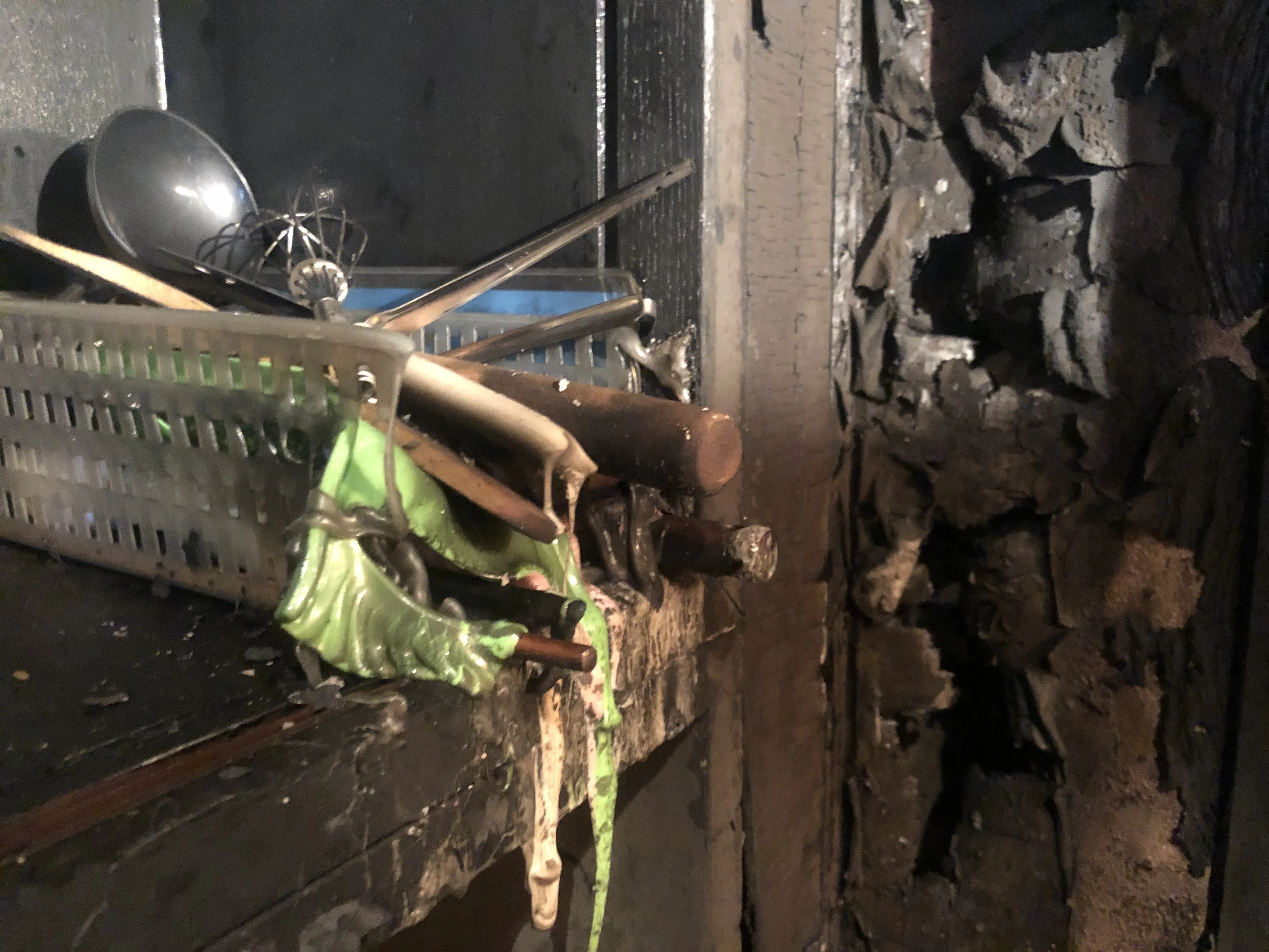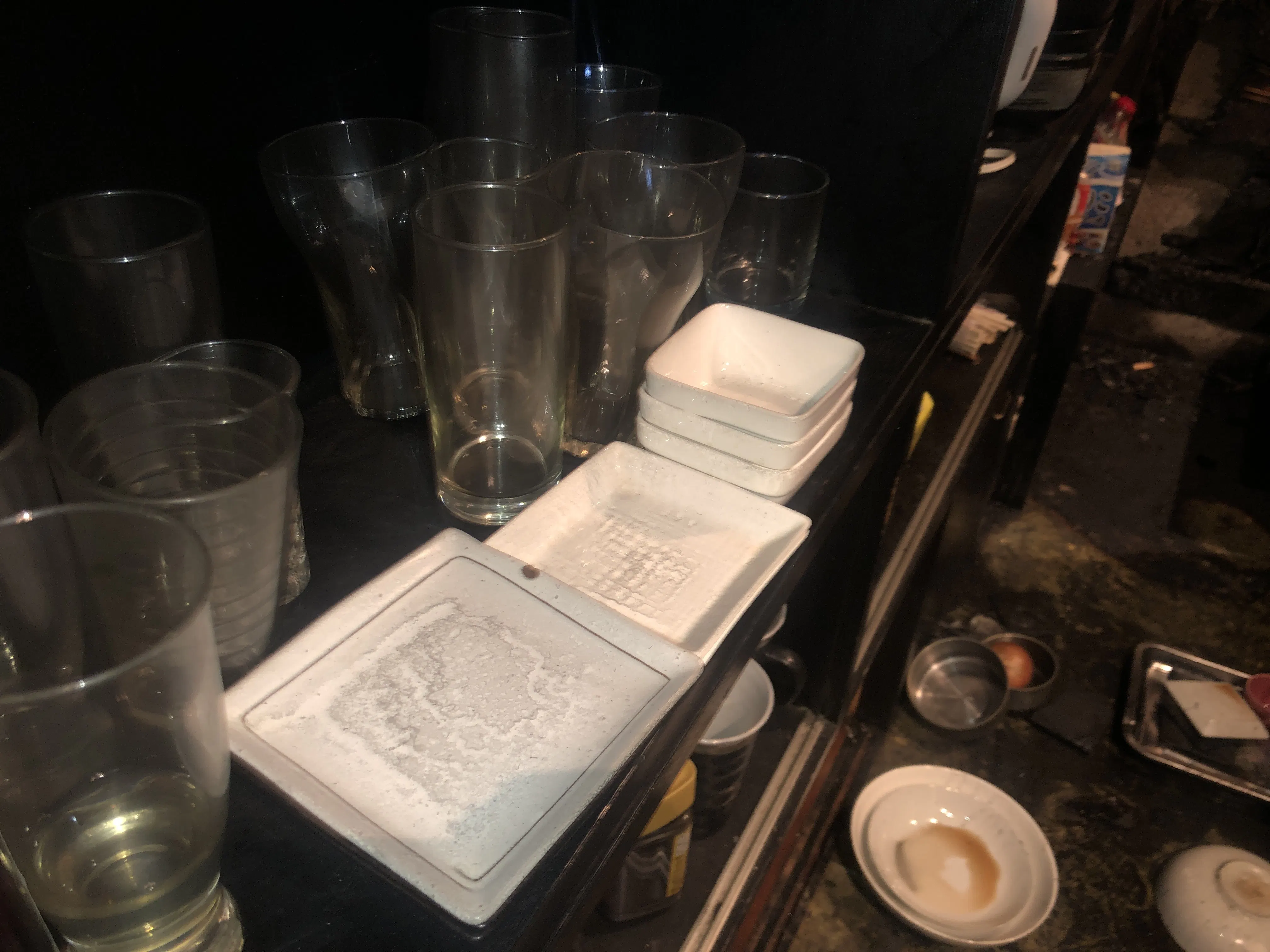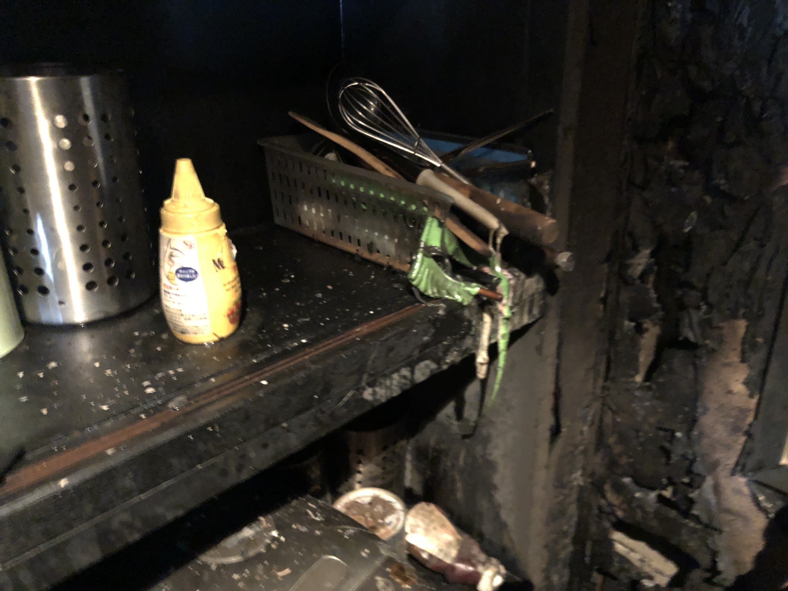 出火原因は調査中ですが詳細は不明。調理場の大半の床や壁などは焼け崩れ落ち、全焼はしなかったもののお皿やグラスその他調理器具諸々は煤(すす)だらけで使い物になりません。本当に少し家に帰るつもりだったので置いていた財布やレジ金も灰になりました。