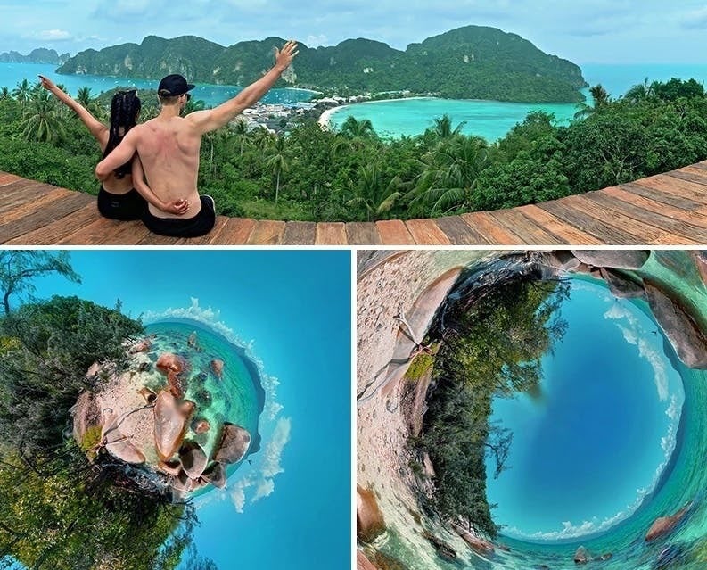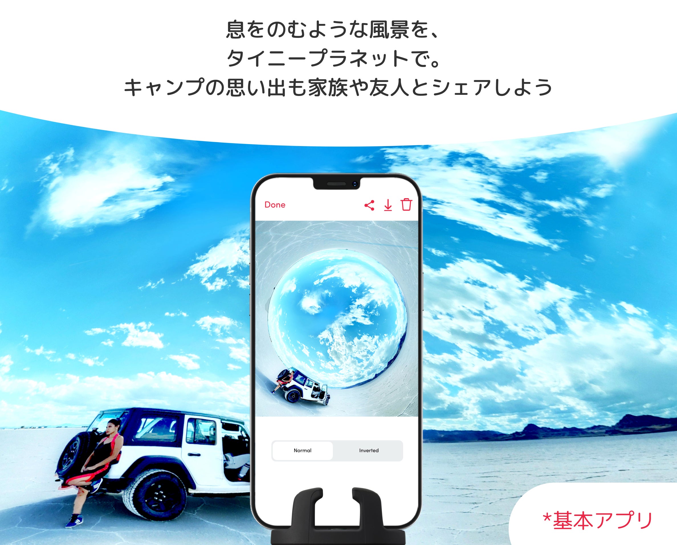 お気に入りの場所を360度撮影して、小さな惑星に作り変えることができます。また、くるっとひっくり返したチューブのような写真も作成可能。