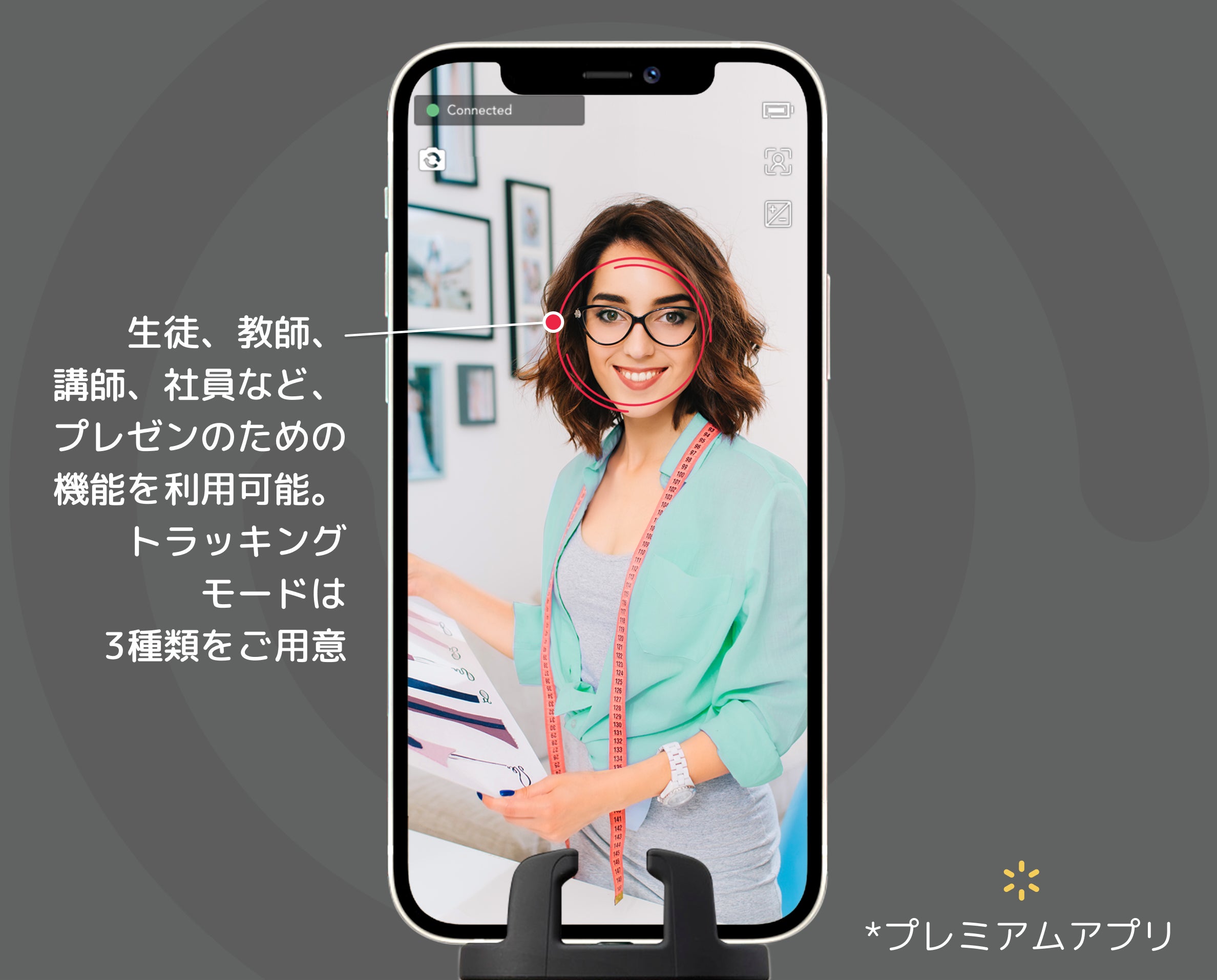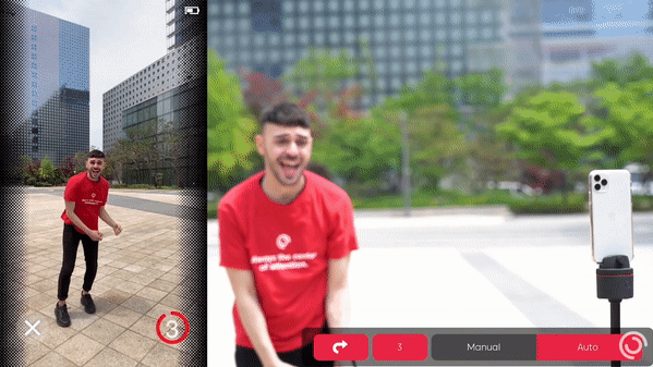 被写体との距離が遠すぎたり、被写体の動く速度が速すぎなければ追尾可能です。 認識率と追尾範囲は、照明、距離、動く速度、スマートフォンカメラの品質、画面上の被写体の大きさなどによって変動します。 スマートフォンの画面を通して被写体をみた際に、被写体の大きさが画面の10%以上あるようにしてください。