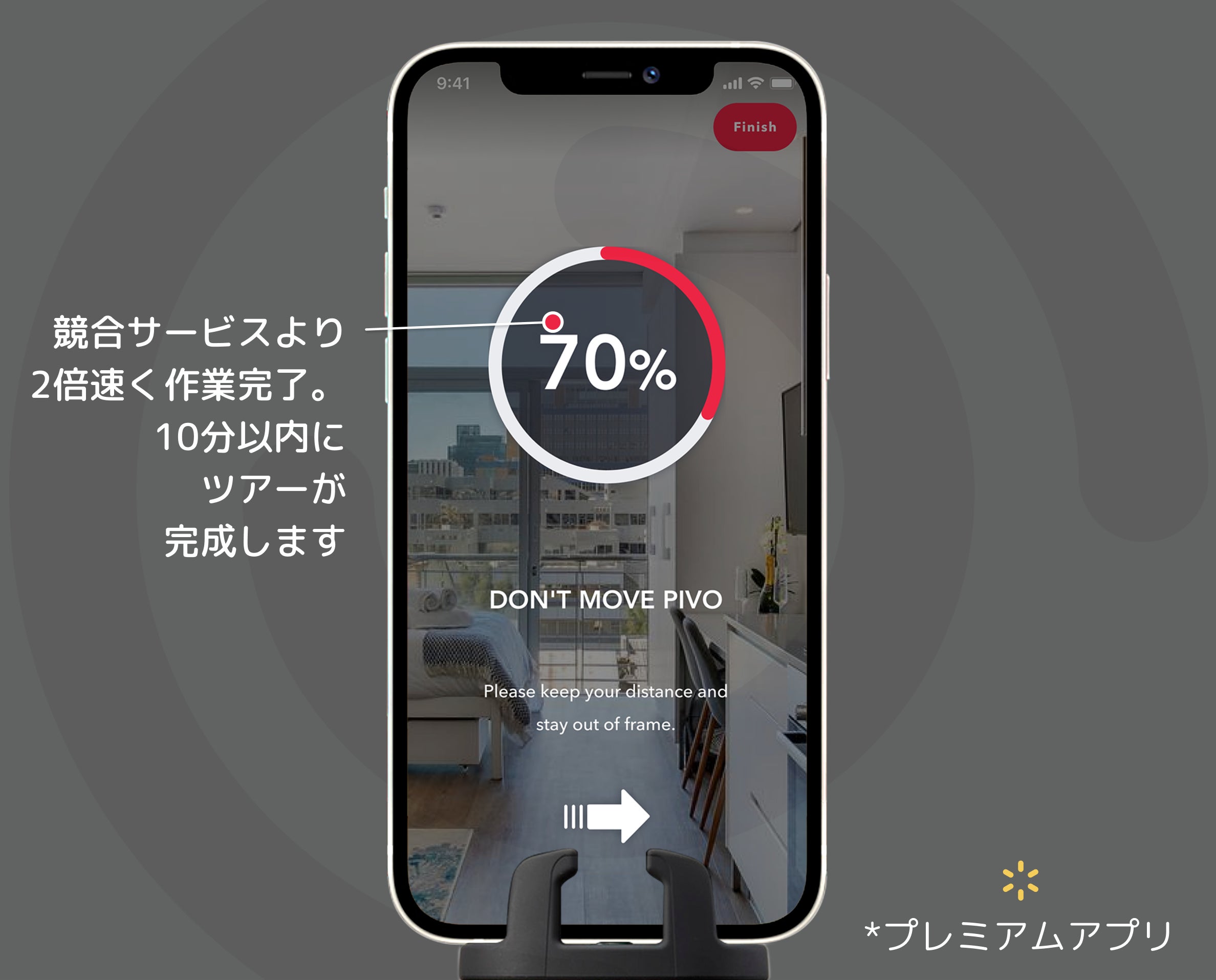 Pivoなら、360°画像を自動で作成できます。部屋に置いてスイッチをオン。複数の場所で撮影すれば、アプリが全ての画像を繋げて、家の中をバーチャルツアー化できます。