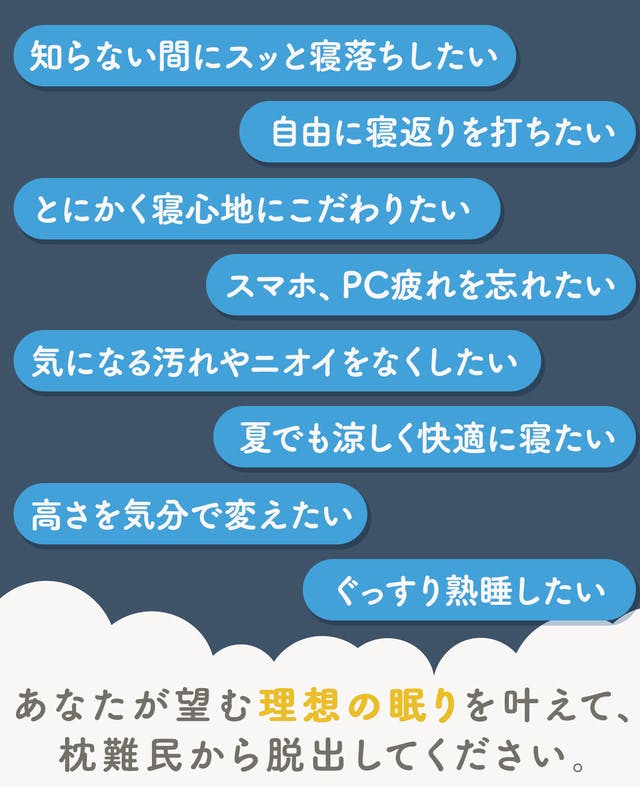 私⾃⾝も睡眠には⻑年悩まされ、たくさんの枕を買い換えては満⾜できない、を繰り返していました。