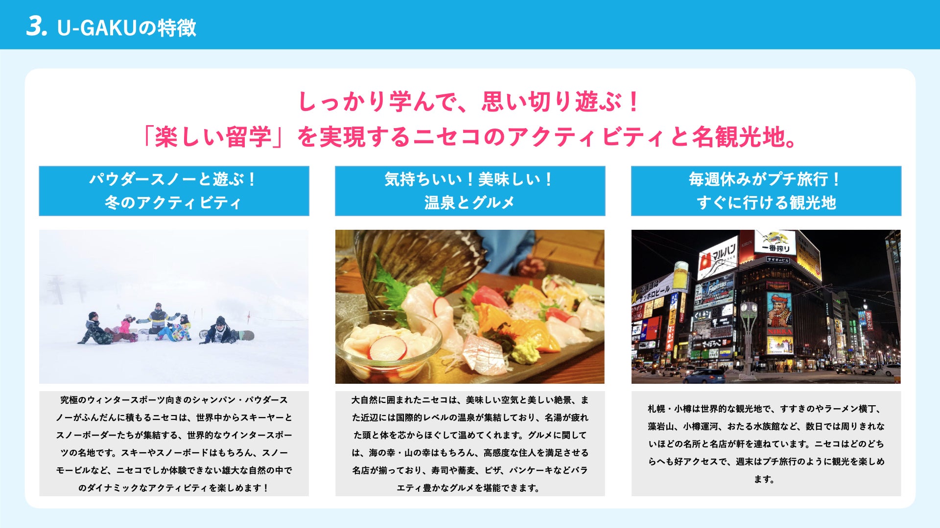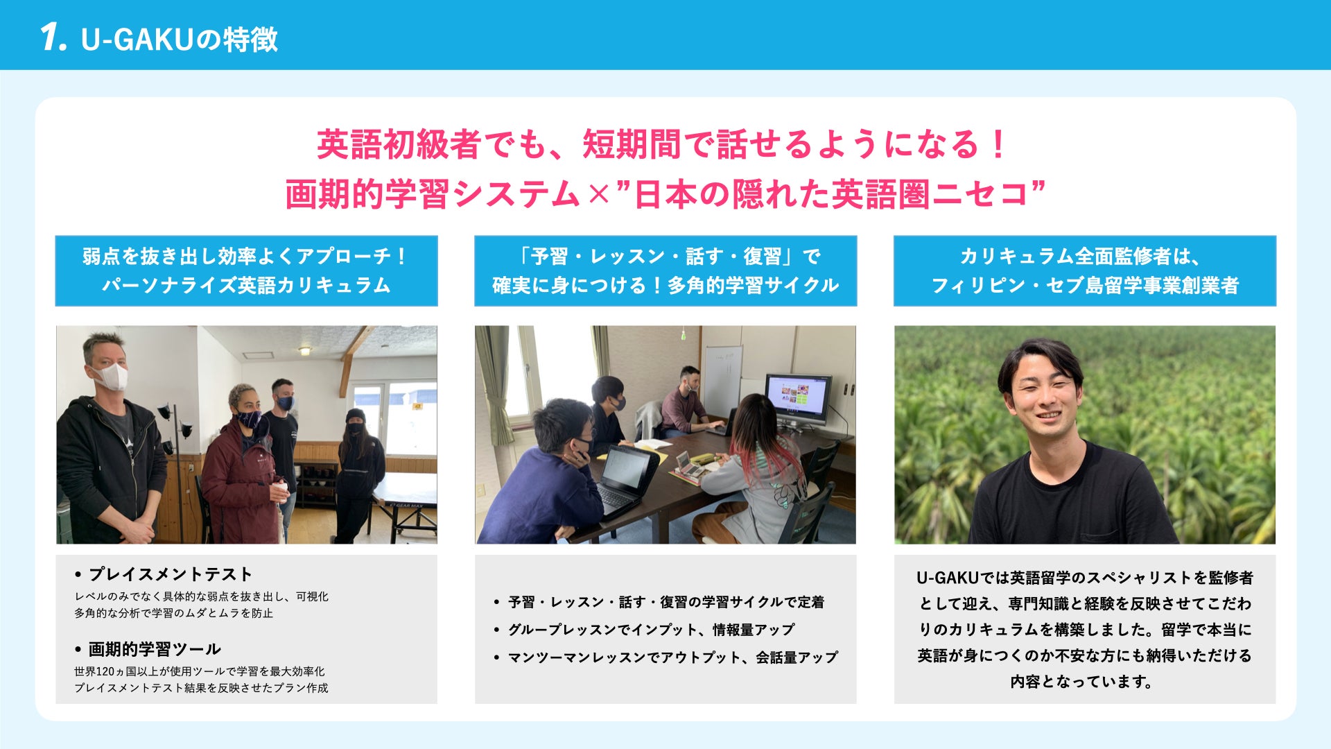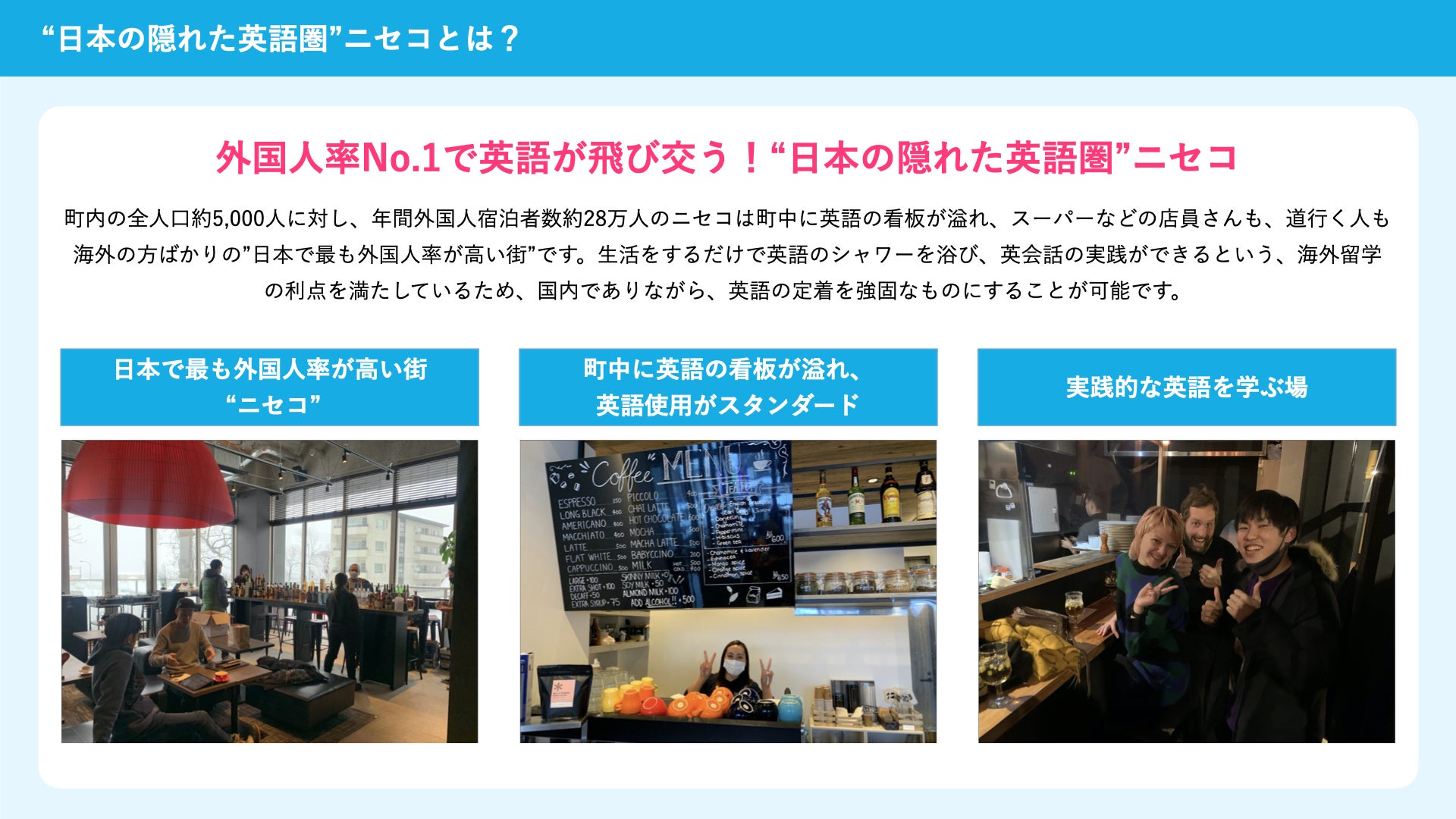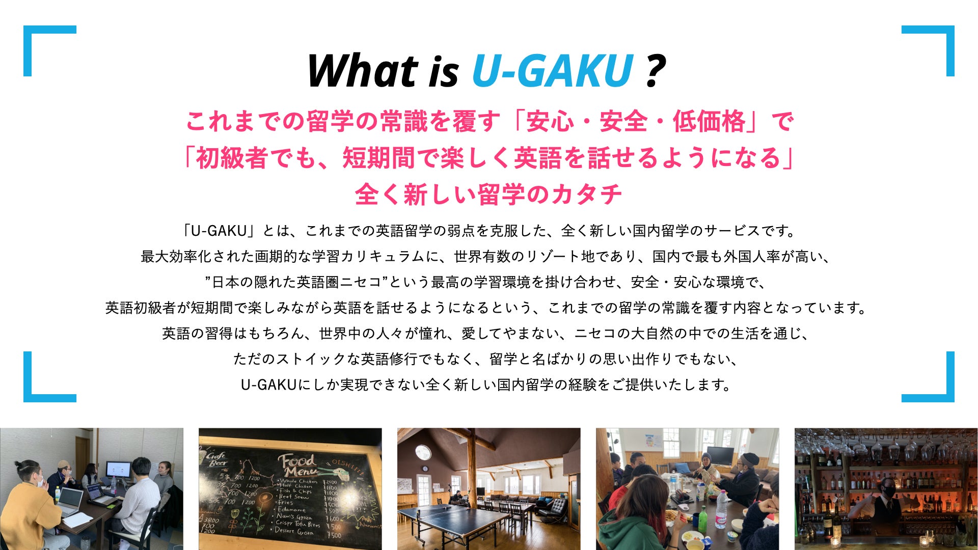 実際に実施先の北海道の"ニセコ"に赴き、現地調査や宿泊先の交渉など事業のサポートを行うにつれて、留学機会逸失による問題の大きさを痛感すると共に、この国内英語留学「U-GAKU」の可能性を感じました。