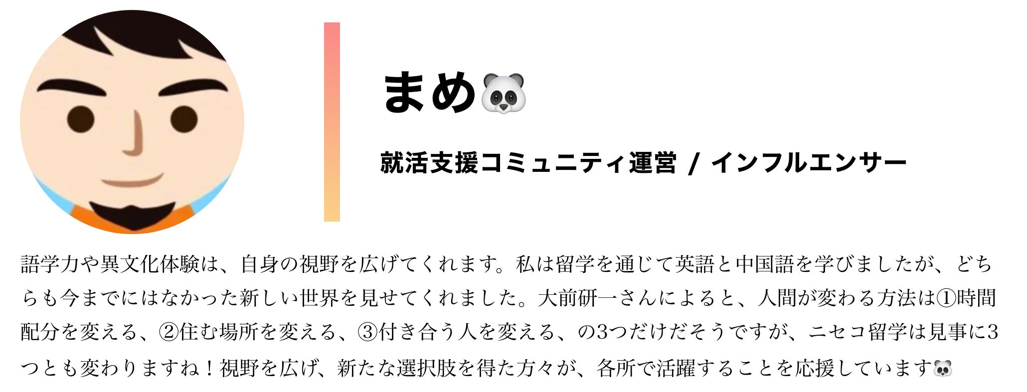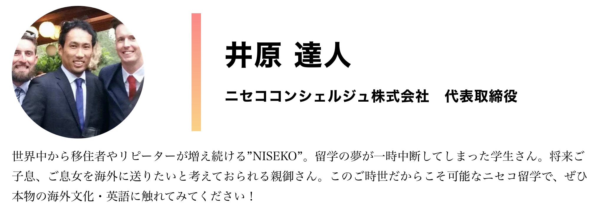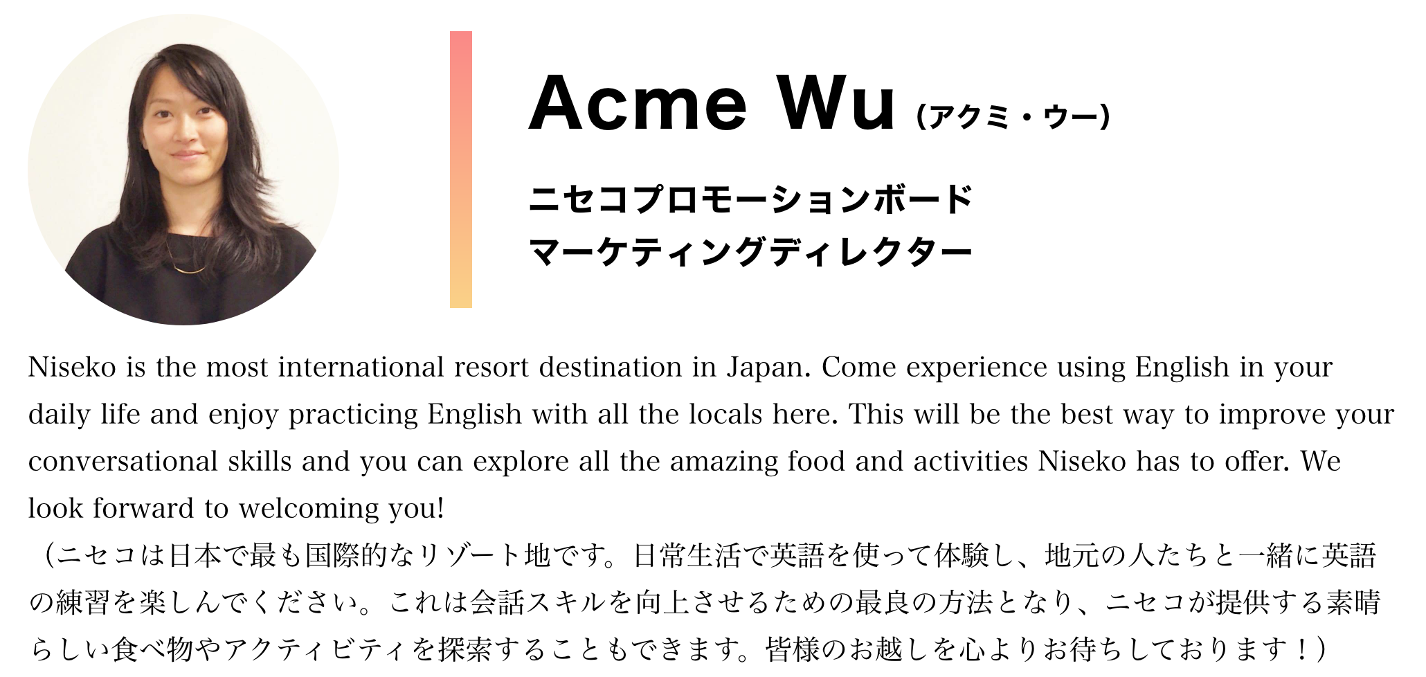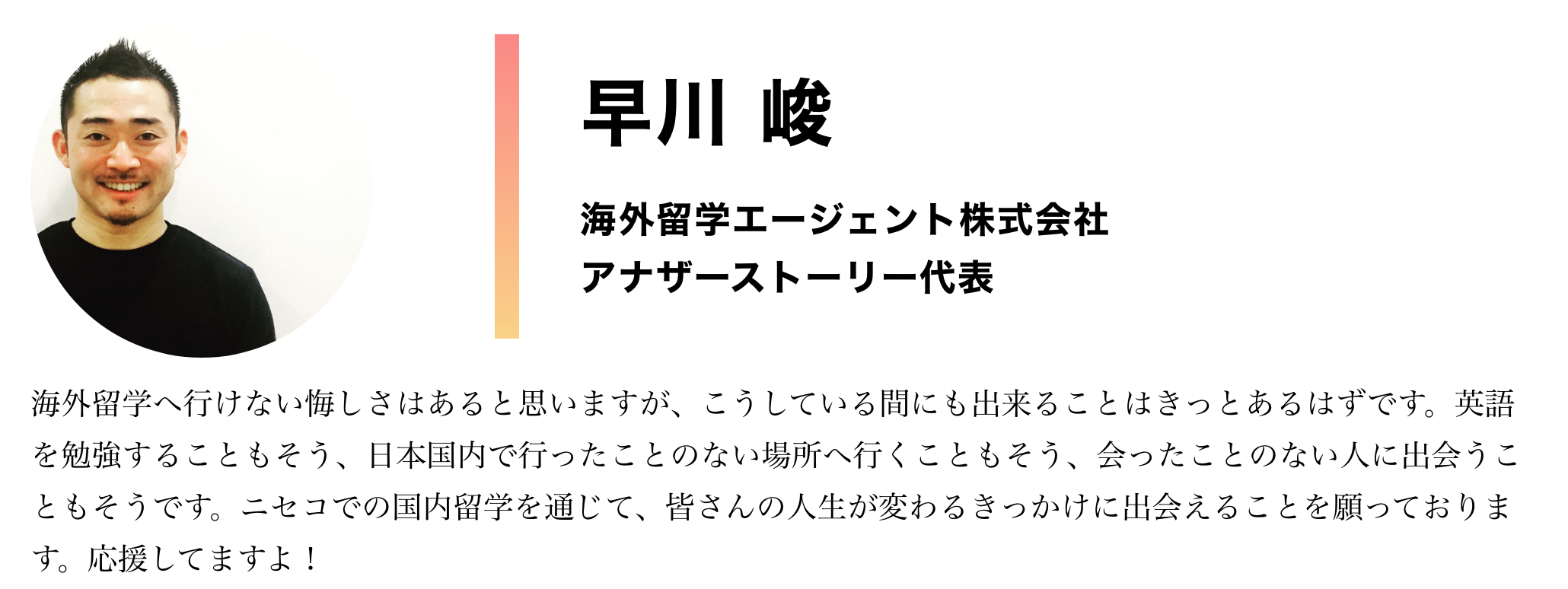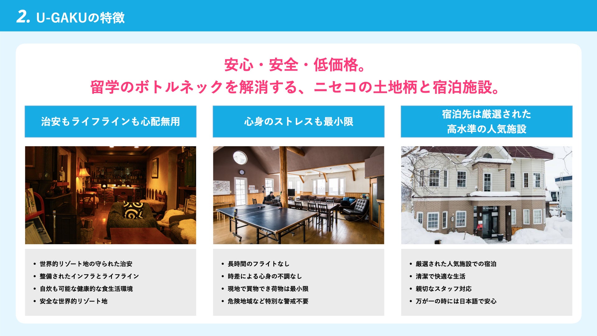 実際に実施先の北海道の"ニセコ"に赴き、現地調査や宿泊先の交渉など事業のサポートを行うにつれて、留学機会逸失による問題の大きさを痛感すると共に、この国内英語留学「U-GAKU」の可能性を感じました。