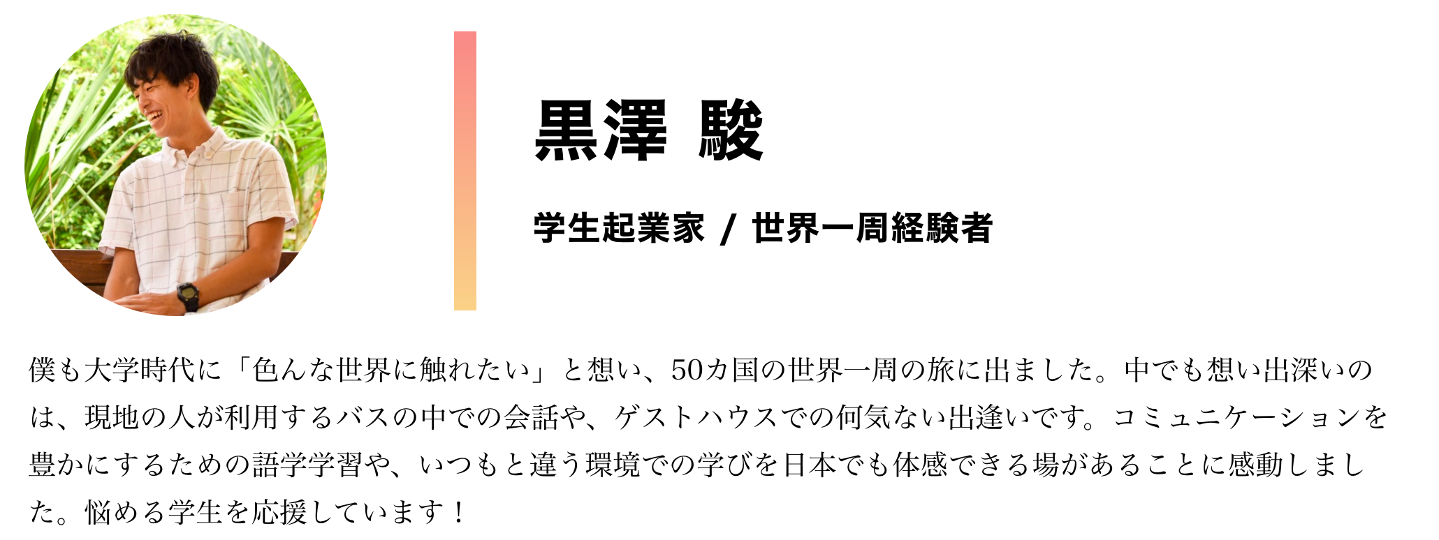 北海道大学在学生。コロナによって留学機会を失われた友達が周囲にいるのを感じ”モヤモヤ”としていた中、創業メンバーと繋がりがあったことから「U-GAKU」の事業に参画。実際にニセコに赴き、現地調査や留学の宿泊先の交渉・手配も行う。事業のサポートを行うにつれて、留学機会逸失による問題の大きさを痛感し、クラウドファンディングの共同発起人となる。