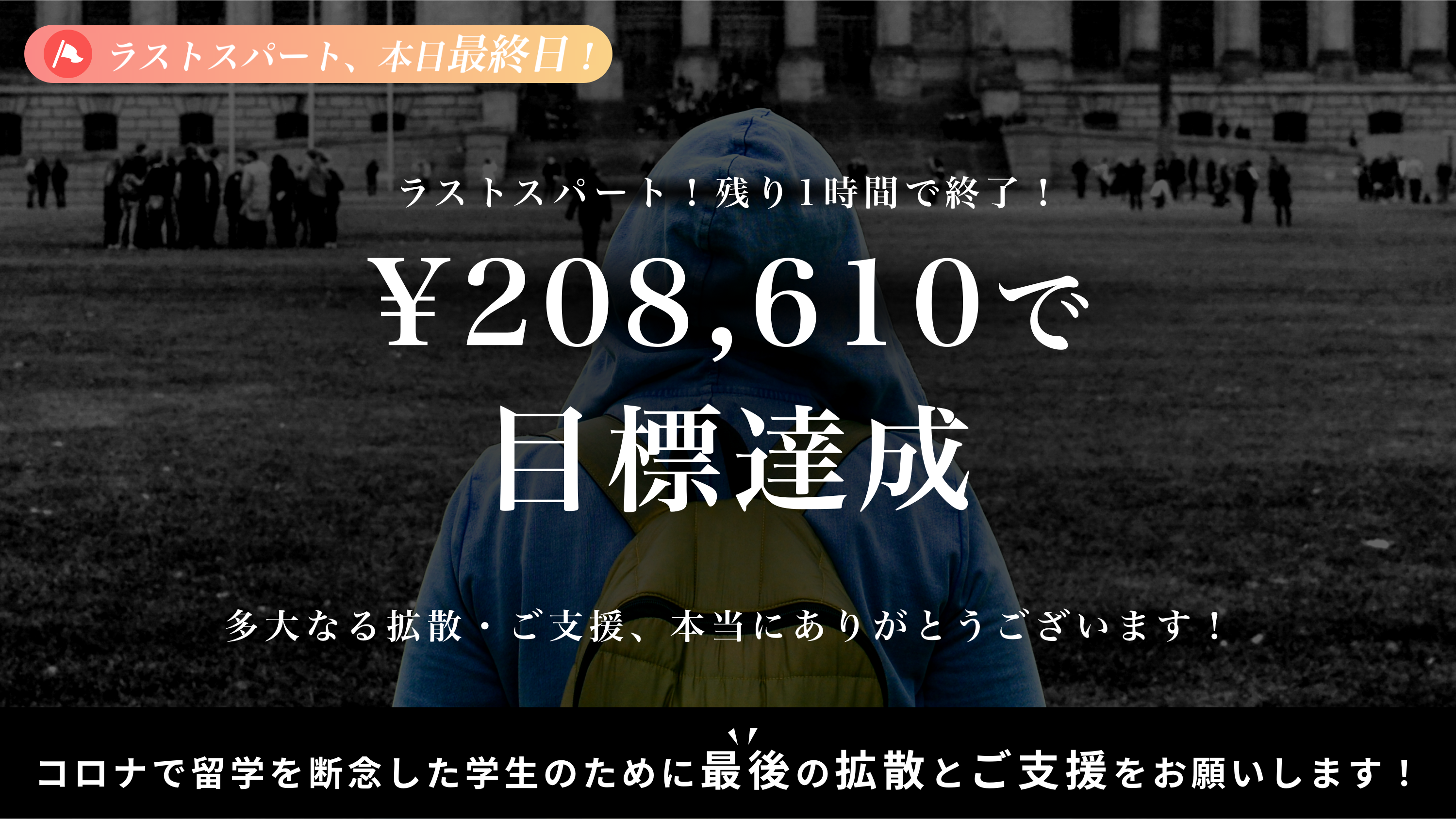2021/02/27 23:02「#留学を止めるな」クラウドファンディング、残り1時間で終了になります!現在の支援総額:2,791,390円支援者数:208人ラスト1時間、よろしくお願い致します!!! もっと見る