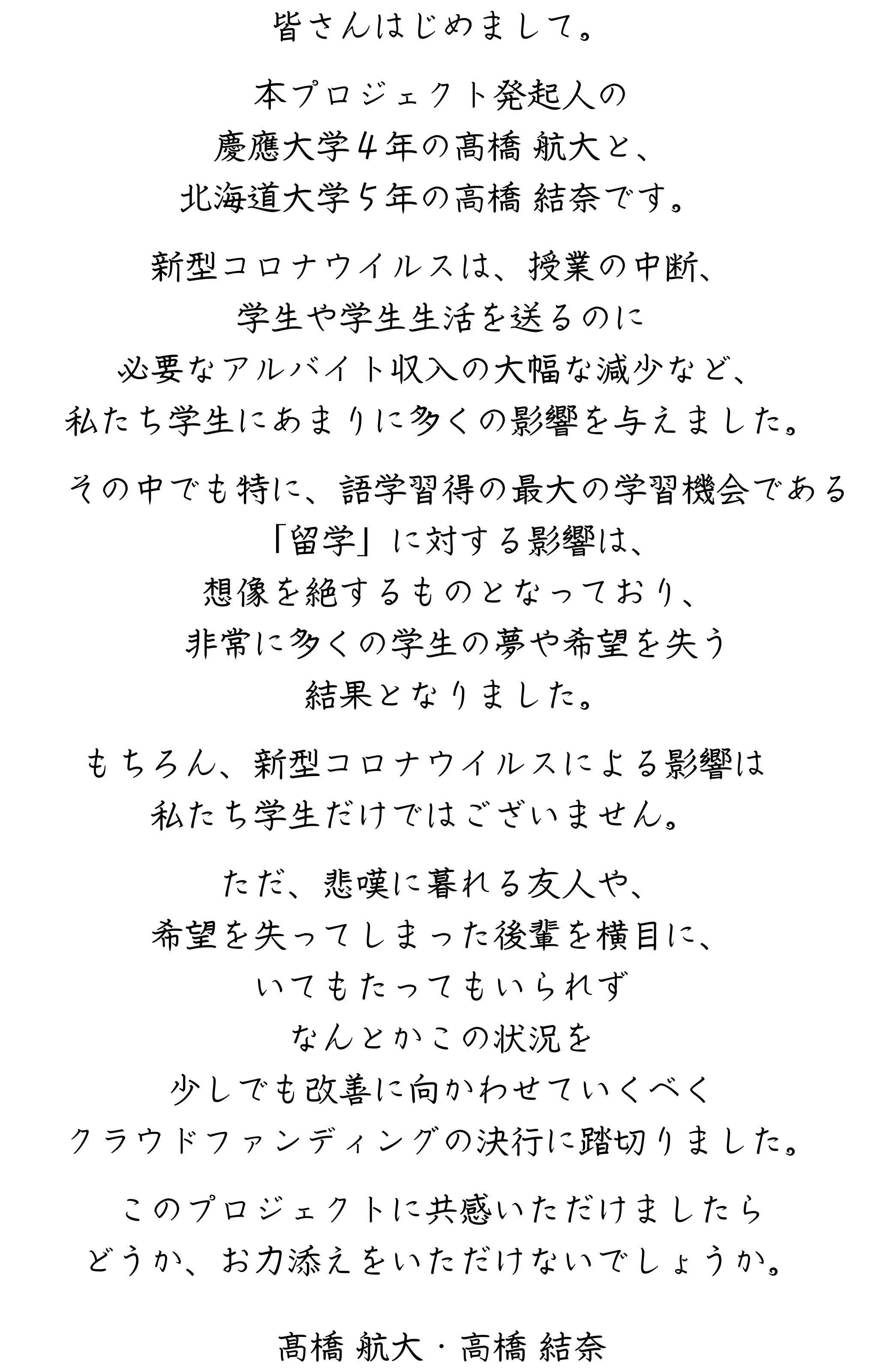 コロナによって、アメリカ留学を断念したことから、クラウドファンディングの共同発起人となる。