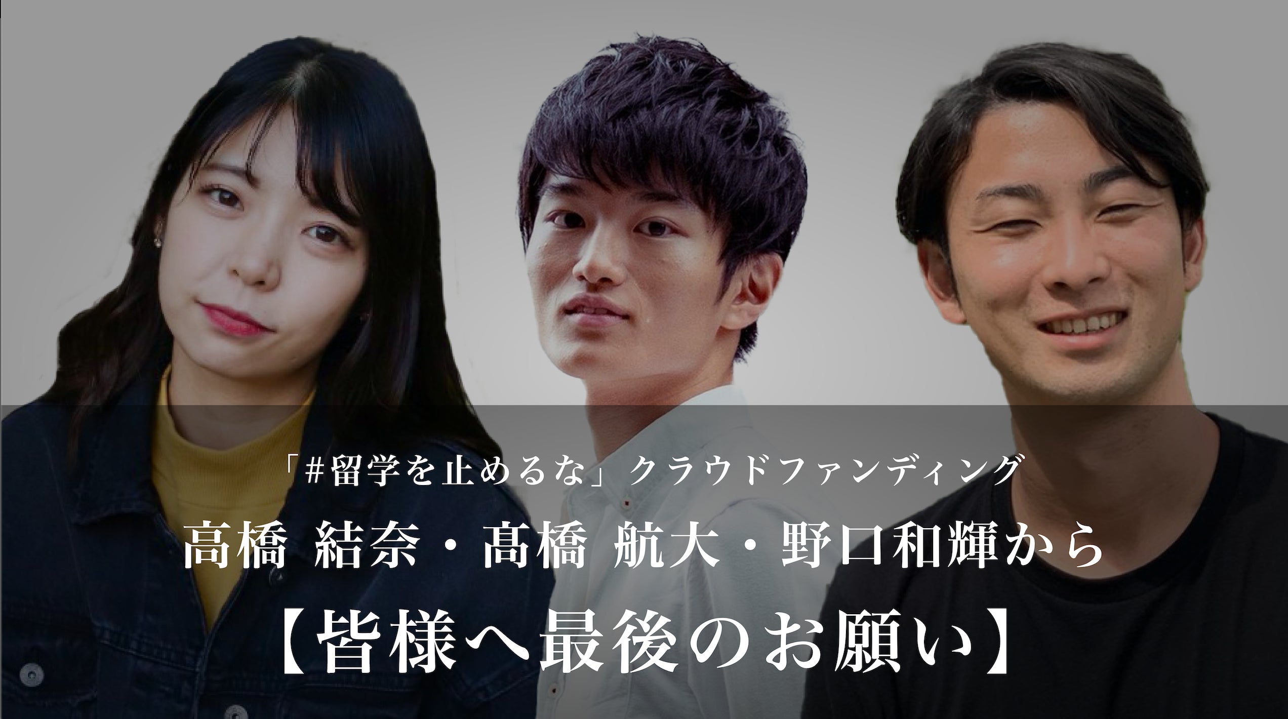 コロナで留学の機会を失った学生のためのクラウドファンディングも残り1日になりました。これまで、119人の方にご支援いただき、2,171,390円円(72%)、まで達成することができました。さらに数え切れないほど、たくさんの方から応援コメント、拡散のご協力をいただいています。これまで、本クラウドファンディングに関わってくださった皆様、本当にありがとうございます。あと1日を残したこのタイミングで、共同発起人の学生2人である高橋航大と高橋結奈、そして私をふくめた3名から【皆様への最後のお願い】として、改めて想いを伝えさせてくださいませ。高橋航大こんにちは。「#留学を止めるな」クラウドファンディング共同発起人の高橋航大です。最初は一大学生の、「コロナで留学する機会を失った学生に、国内留学という新しい選択肢を届けたい」とう願いから始まったこのクラウドファンディングですが、今では、ご支援してくださる皆様のサポートもあって日本の大学生全体を巻き込む大きなムーブメントになりつつあります。皆さま、ここまでたくさんのご支援を誠にありがとうございます。大学生になって経験したいこととして名高い「留学」このコロナによってその機会を奪われてしまった人の数は枚挙にいとまがありません。僕もそのうちの1人でした。高校生の時に初めて行ったアメリカに感化されて、大学生になったら必ずや留学に行くのだ!という想いを持ち日々準備を重ねてきました。ワクチンも打って、いざ出発という心意気になってすぐ、出発日の3日前でした。大学側から連絡があり、「大変残念ではありますが、昨今のコロナウイルスの影響を鑑みて、今季の新規留学者受け入れはキャンセルとさせていただきます。」送られてきたメールはそう長くはありませんでしたが、留学を心待ちにしていた私の心にはポッカリ穴が空きました。「なんでこのタイミングなんだ。」「これまであれだけ準備してきたのに。」出てくるのはそんな言葉ばかりです。しかし、そのタイミングで思ったんです。苦しんでるのは自分だけじゃない。高校生の時からずっと留学を心待ちにしていた人だっている。だったら、自分が動いて何かしないと。そんな想いで動き出しました。ひょんなことで出会った野口さん。彼となら自分が成し遂げたかったことを実現できるかもしれないと思い、共にクラウドファンディングに取り組むことを決意しました。そんな形でスタートしたクラウドファンディングも残すところあと1日となりました。私は、この国内留学こそが、今世界を覆う暗い空気感を払拭するきっかけになると信じております。今一度、私たちに力を貸してください。残り1日よろしくお願い致します。高橋航大高橋結奈 皆様、いつも応援ありがとうございます。「#留学を止めるな」クラウドファンディング共同発起人の高橋結奈です。最後の最後に皆様へのお願いと言うことで、うまく言葉にできるかわかりませんが、私の気持ちをお伝えしたいと思います。私は1人の学生として、同年代の学生たちに「学びの機会を諦めないでほしい」という気持ちで今日までやってきました。ご支援してくださった方のコメントに「留学で人生が変わった」という言葉を結構見かけました。それほど、留学という経験に多くのチャンスが含まれているのだと痛感しました。私がこのクラファンに携わり、感じたのは、自分の1歩は小さくても応援してくださる方が現れ、輪が広がると、それが誰かの人生の転機に関わるくらいの大きな1歩になるということです。なので、私がクラウドファンディングで踏み出した1歩が、学びの機会を失った学生まで届くように、最後の最後まで諦めず走り続けます。何度もお願いで申し訳ないですが、皆様の温かいご支援が、学生の人生のターニングポイントになったり、新たな自分に出会えるチャンスにつながります。最後にもう一度、私たちに力を貸していただけませんでしょうか。あと1日で本当に本当に終了なので最後の一押しの皆様のご支援、ぜひよろしくお願いします。国内留学U-GAKU代表 野口和輝皆さま、いつもご支援と応援をどうもありがとうございます。国内留学「U-GAKU」代表の野口です。私はあまり、文章が得意ではないのですが、皆様に感謝の気持ちと、最後のお願いをさせていただきたく、思うまま、正直に書かせていただきます。「学生から学習と挑戦の機会を奪いたくない」私たちの願いはただそれだけです。その思いだけで、今日までクラウドファンディングを進めてきました。私は、国内留学「U-GAKU」の前に、自身で留学事業を立ち上げました。その中で「留学」という一つの機会を通じ、ただ語学を学ぶのではなく、価値観の異なる人たちと出会ったり挑戦できる環境によって多くの失敗をしながらも成長をする学生の姿と笑顔を見て、留学というものの素晴らしさ、価値を確信しました。「留学」というと、贅沢な学生の思い出づくりという印象も