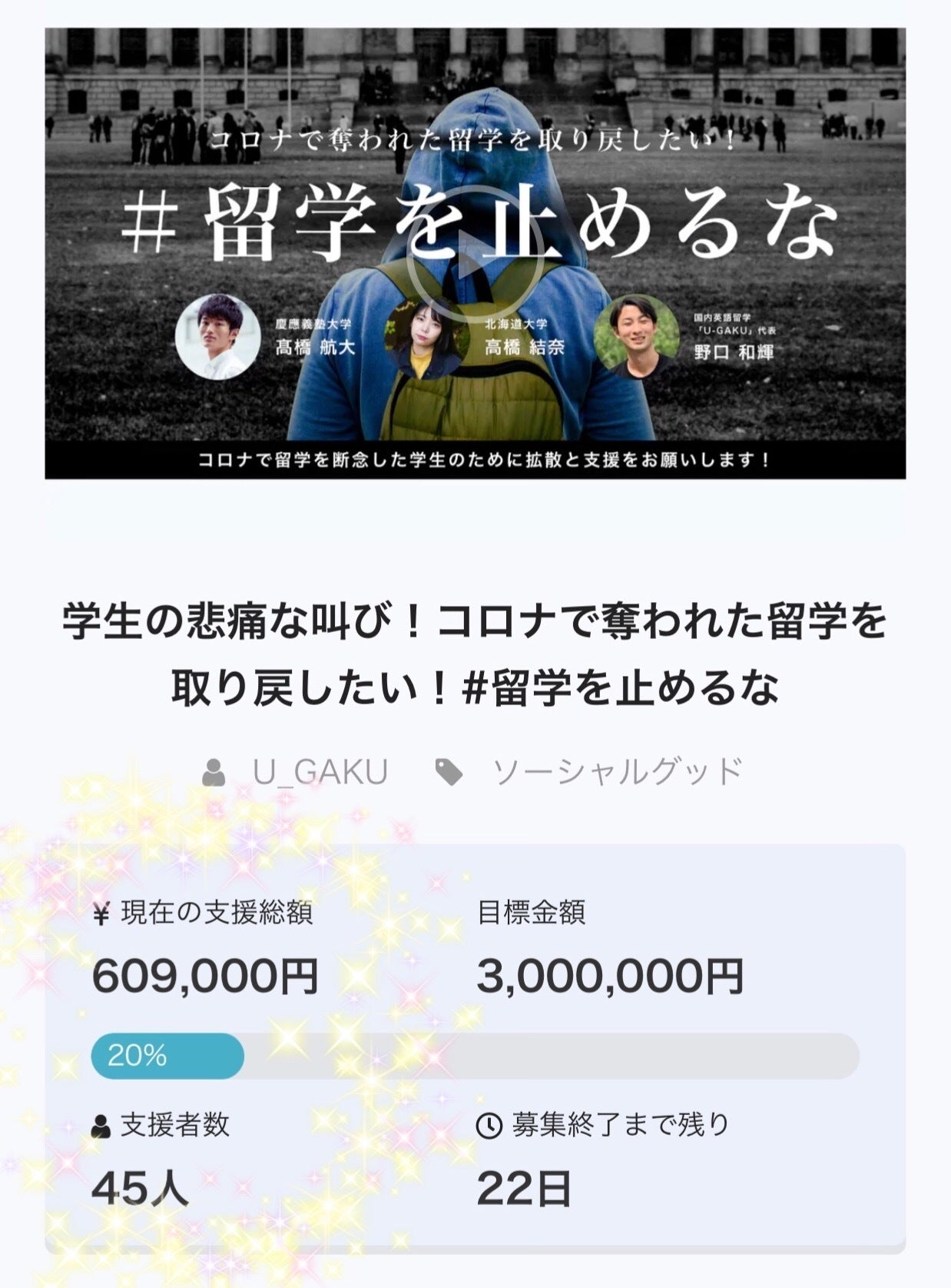 本日、開始3日にして、目標金額の20%を達成いたしました!!・‥…━…‥・‥…━…‥・‥…━…‥・‥…━…‥・‥…現在のご支援金額609,000円ご支援者様数45名様・‥…━…‥・‥…━…‥・‥…━…‥・‥…━…‥・‥…これもひとえに、ご支援者様、各方面でご協力いただきました皆様のおかげと、深く感謝しております。ご支援者様にお喜びいただけますよう、更に魅力的なリターンの計画も進めております・・!一人でも多くの学生に留学の機会を届けるべく、努力して参りますので、引き続き、応援していただけますと幸いでございます。プロジェクト終了まで、どうぞよろしくお願いいたします!高橋航大 高橋結奈 野口和輝スタッフ一同