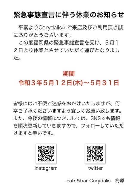 2021/06/22 12:15こんにちは。Corydalis店長の梅原です。皆様に改めて休業のお知らせです。2021年6月20日で、福岡県に発令されていた緊急事態宣言が解除となりましたが、依然としてまん延防止等重点措置(以下まん防)が発令されております。それを受けまして、当店ではTwitter、Instagramでもお知らせさせていただいておりますが、解除予定日の同年7月11日まで、休業の対応を取らせていただいております。2021年5月12日より休業を行い、2ヶ月の間営業を行うことが出来ず、起こしいただいていたお客様と乾杯する事が出来ないのはとても心苦しく、悔しい気持ちでいっぱいです。ですが、まん防が解除されてまた皆様とお会い出来る日を心待ちにしながら、我々スタッフもレベルアップして皆様をお迎えできるよう、虎視眈々と準備を進めております。改めまして、皆様のご支援をお待ちしております。よろしくお願い致します。Corydalis 店長 梅原 もっと見る
