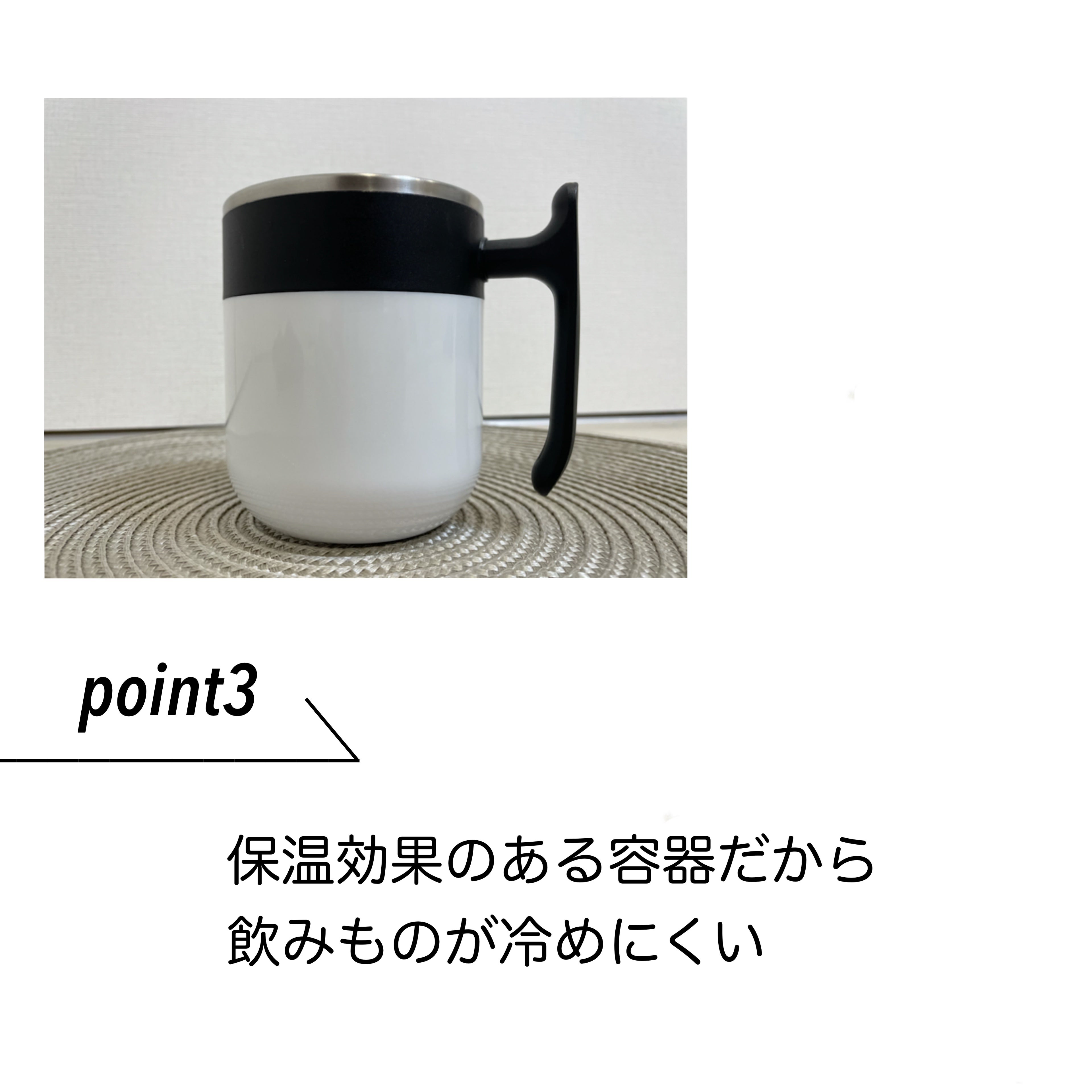熱いスープや飲み物をかき混ぜることによって冷ますのもみなさんご存じの冷まし方かと思います。この製品の勝手に混ぜてくれることを応用し、熱々のコーヒーや、紅茶、コーンスープ等を自動で冷ましてくれるので、熱々の飲み物が苦手だけど少し暖かい飲み物を飲みたい。