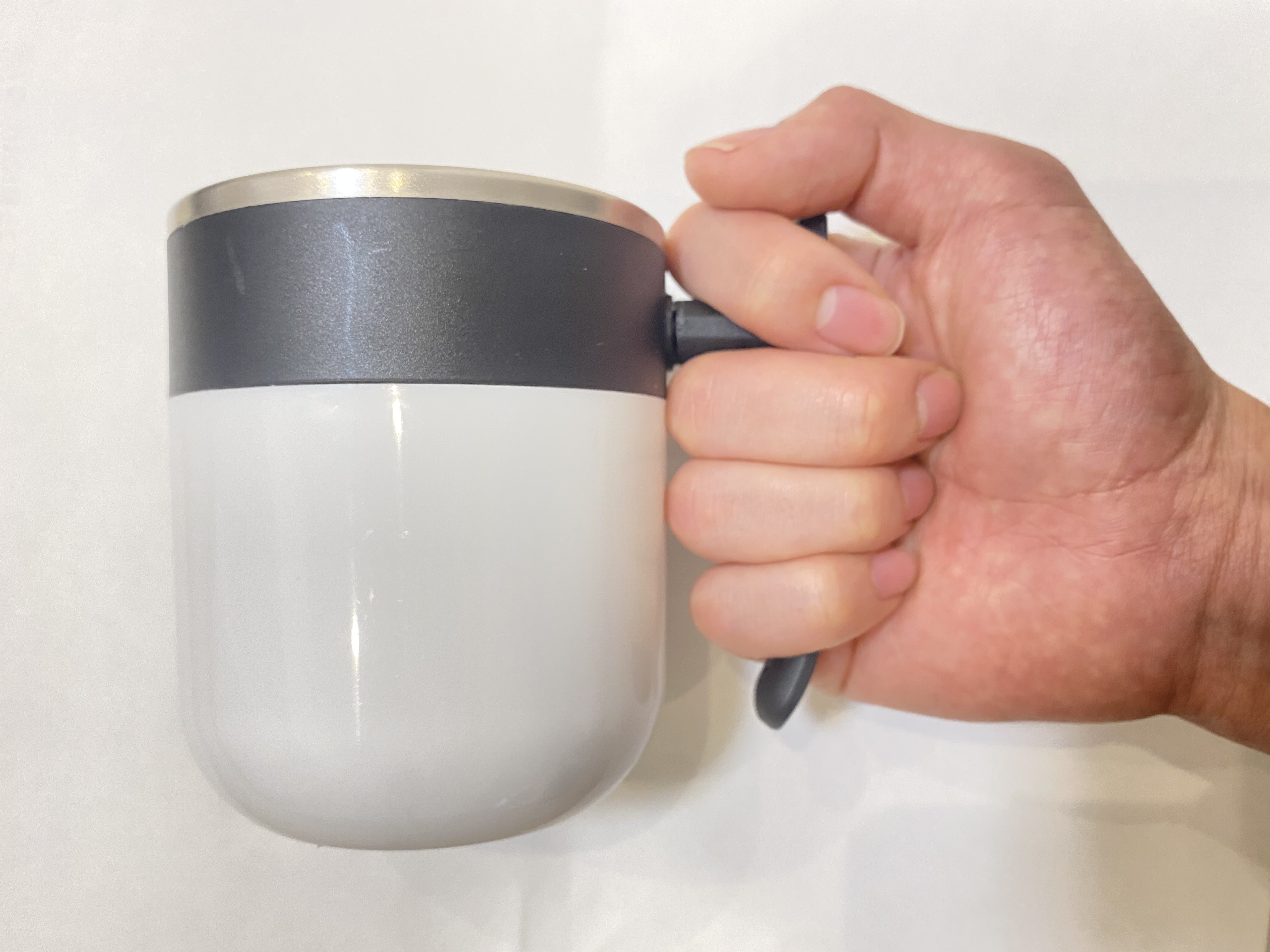 人間工学に基づいたハンドルは手の平全体でキャッチできるため、コップが軽く感じ傾くことや滑る心配から解放してくれます。また、容器とは別の素材を使用しており、コップの熱を完全に遮断し熱いコーヒーなどを入れた際に感じる熱を全く感じさせません。