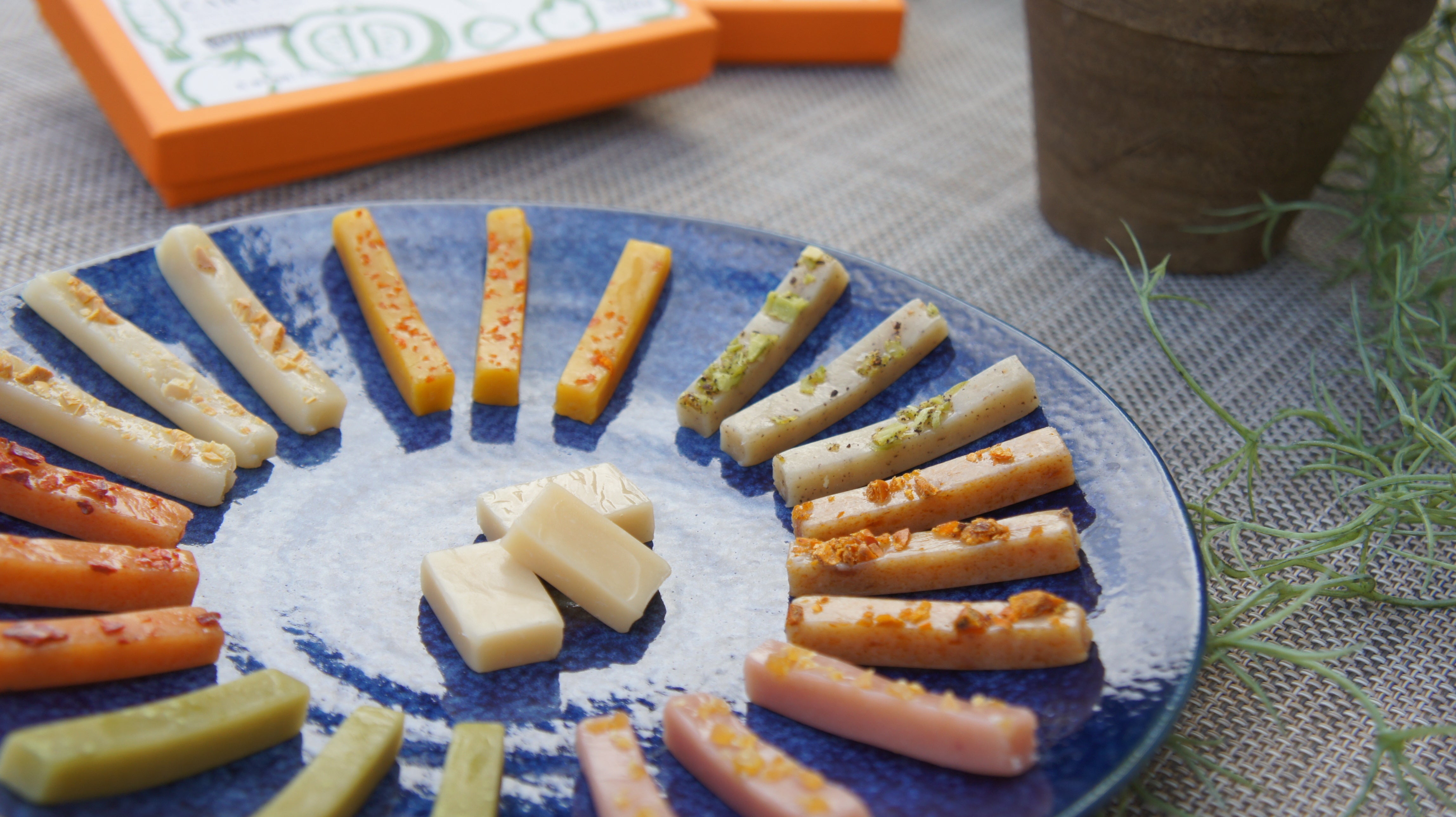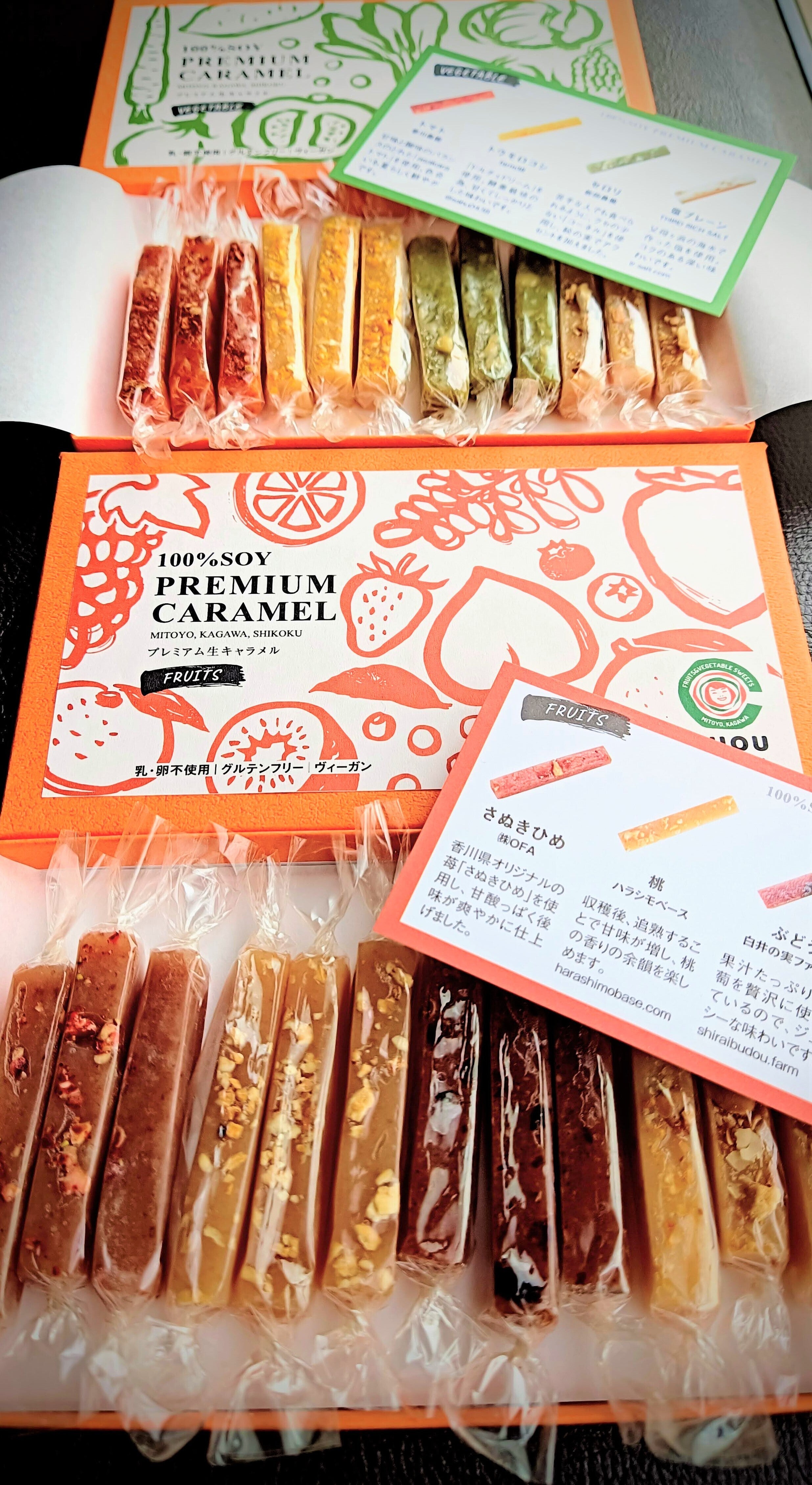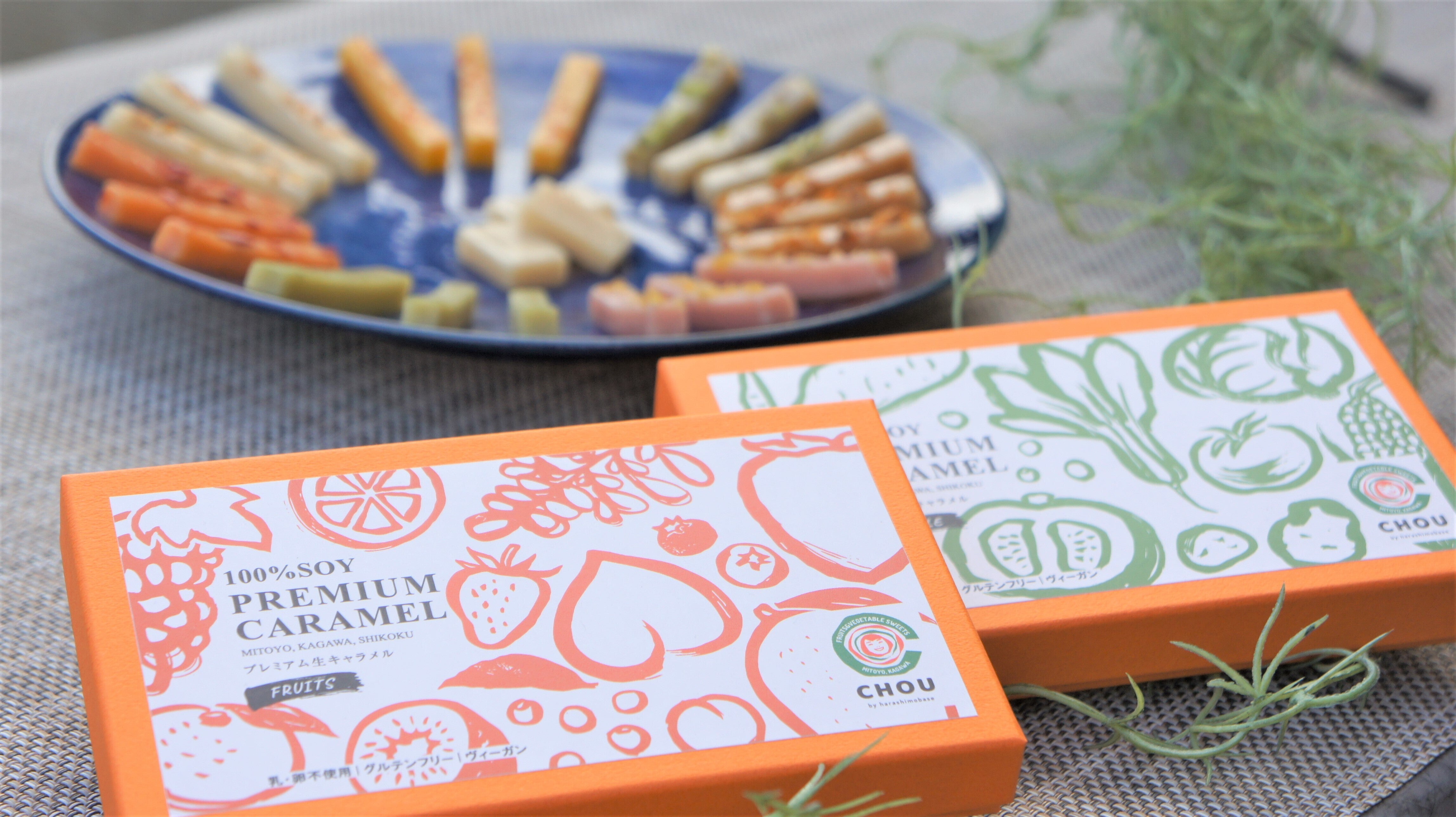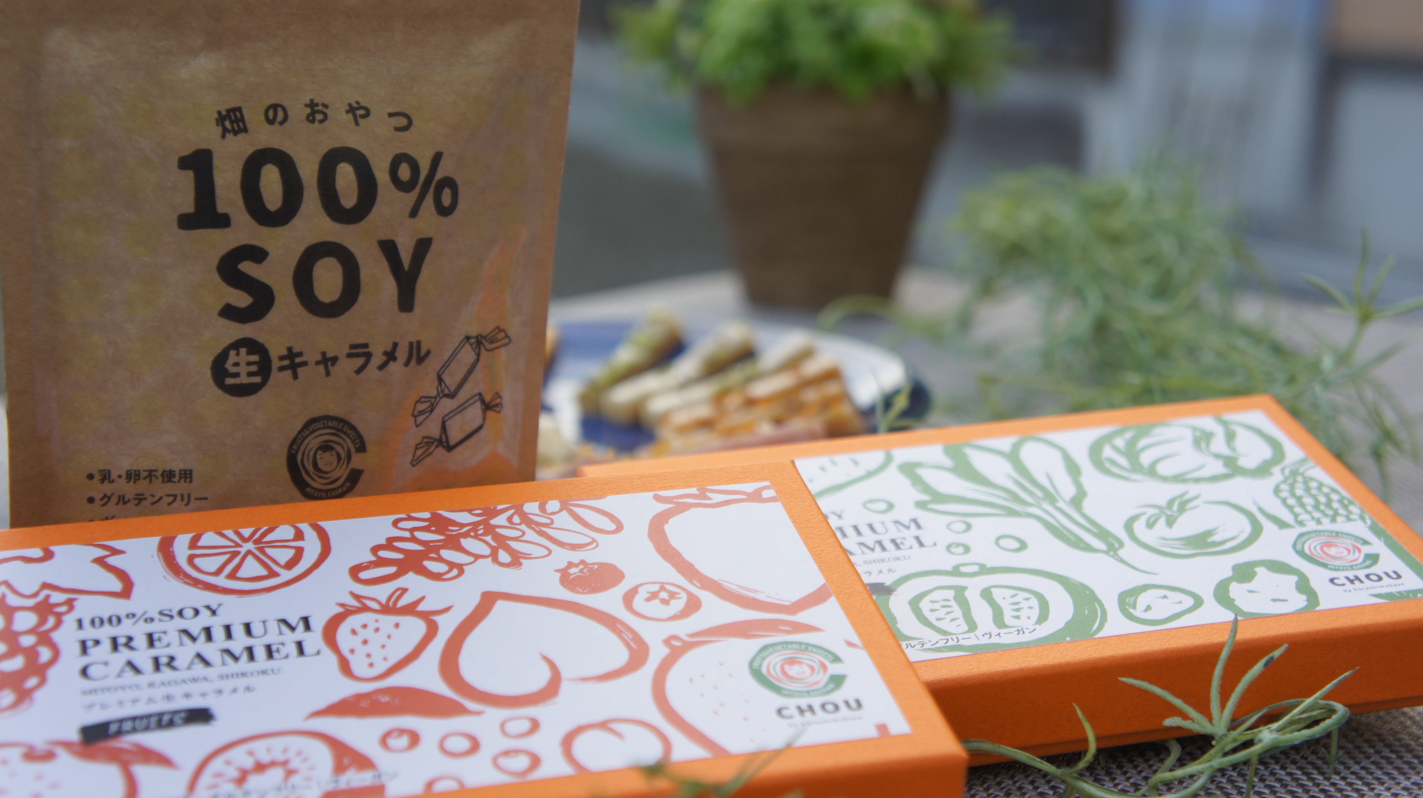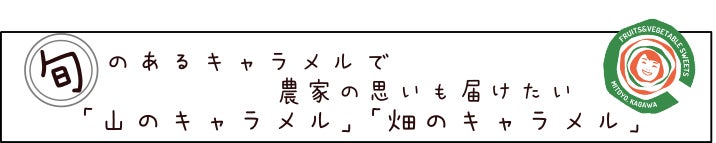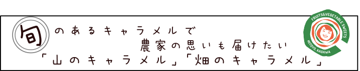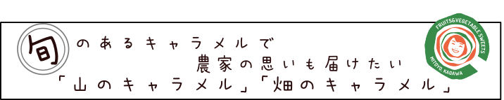 私たちは普通のキャラメルを作るだけでなく、一生懸命育てた野菜や果物と農家の思いを「畑のキャラメル」と「山のキャラメル」に込めました。もちろん乳製品不使用です。