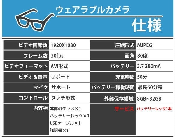 フルHD(1920×1080)で録画できる高性能小型ビデオカメラ。メガネの中心にレンズが付いているので、手ぶらで録画できるほか、目線の動きそのままに撮影できるのがとても便利です。